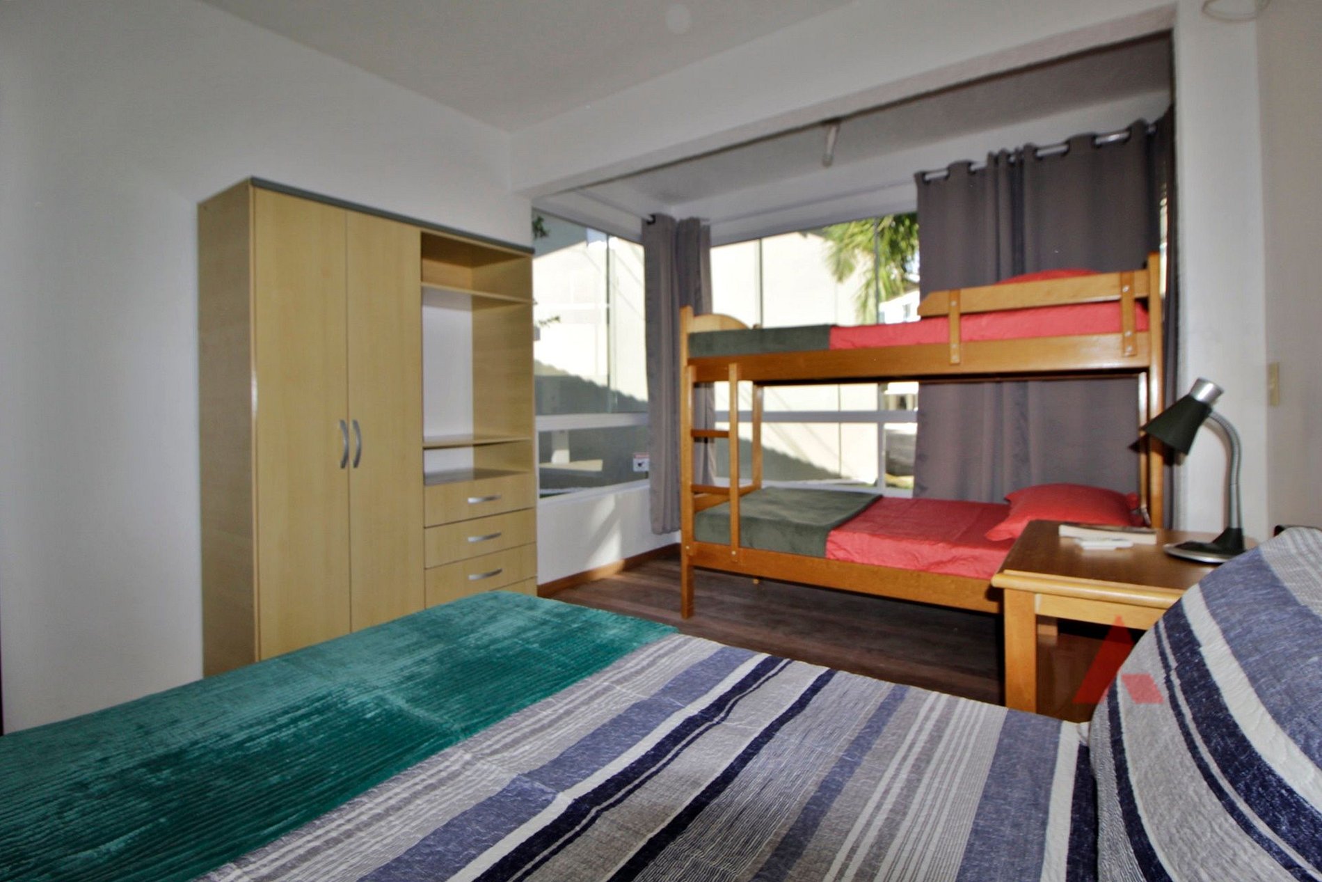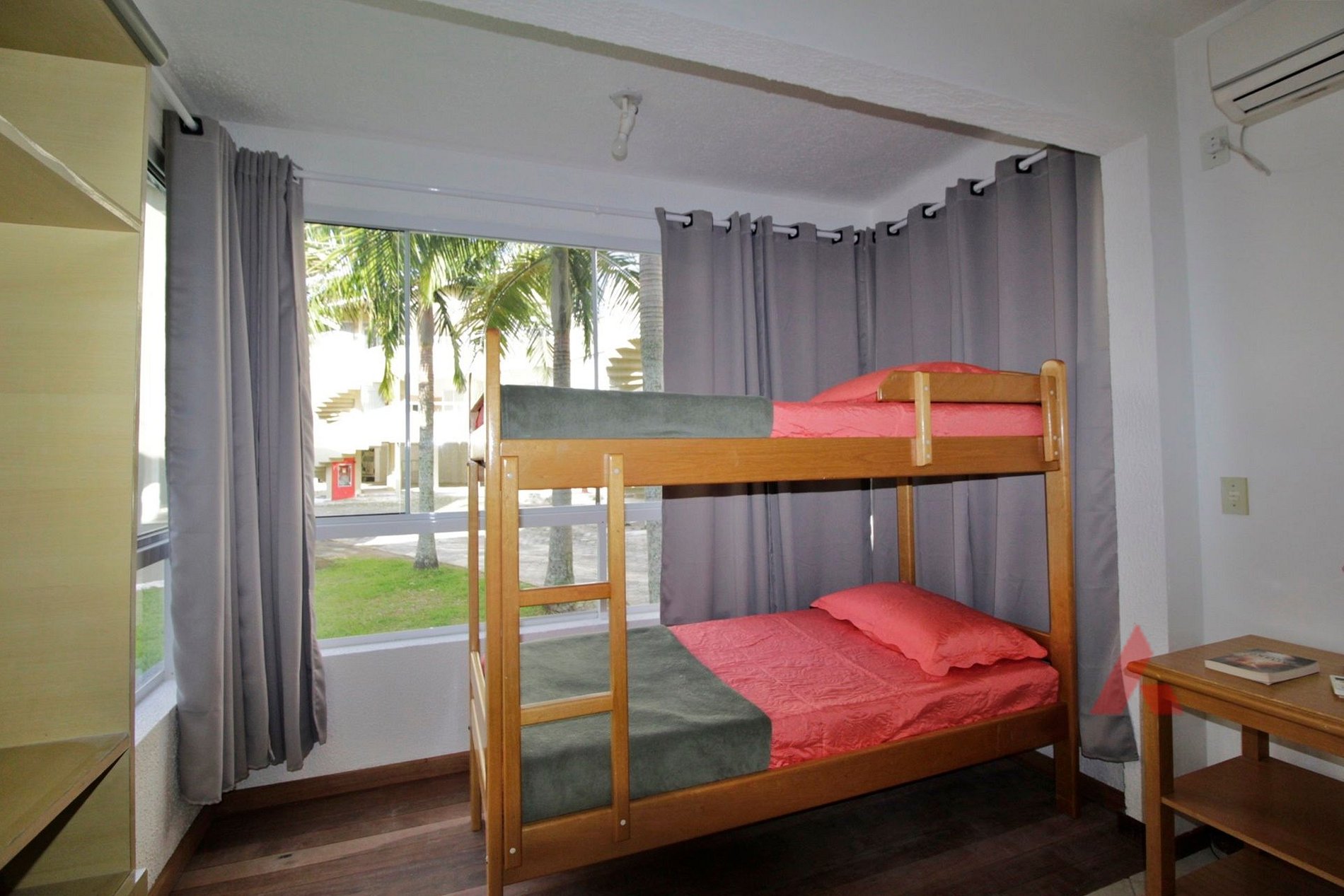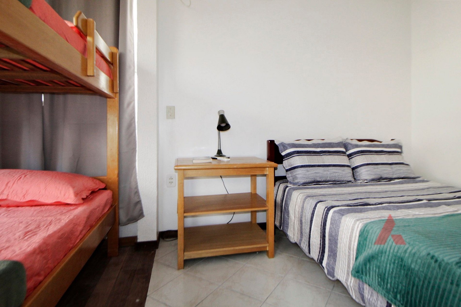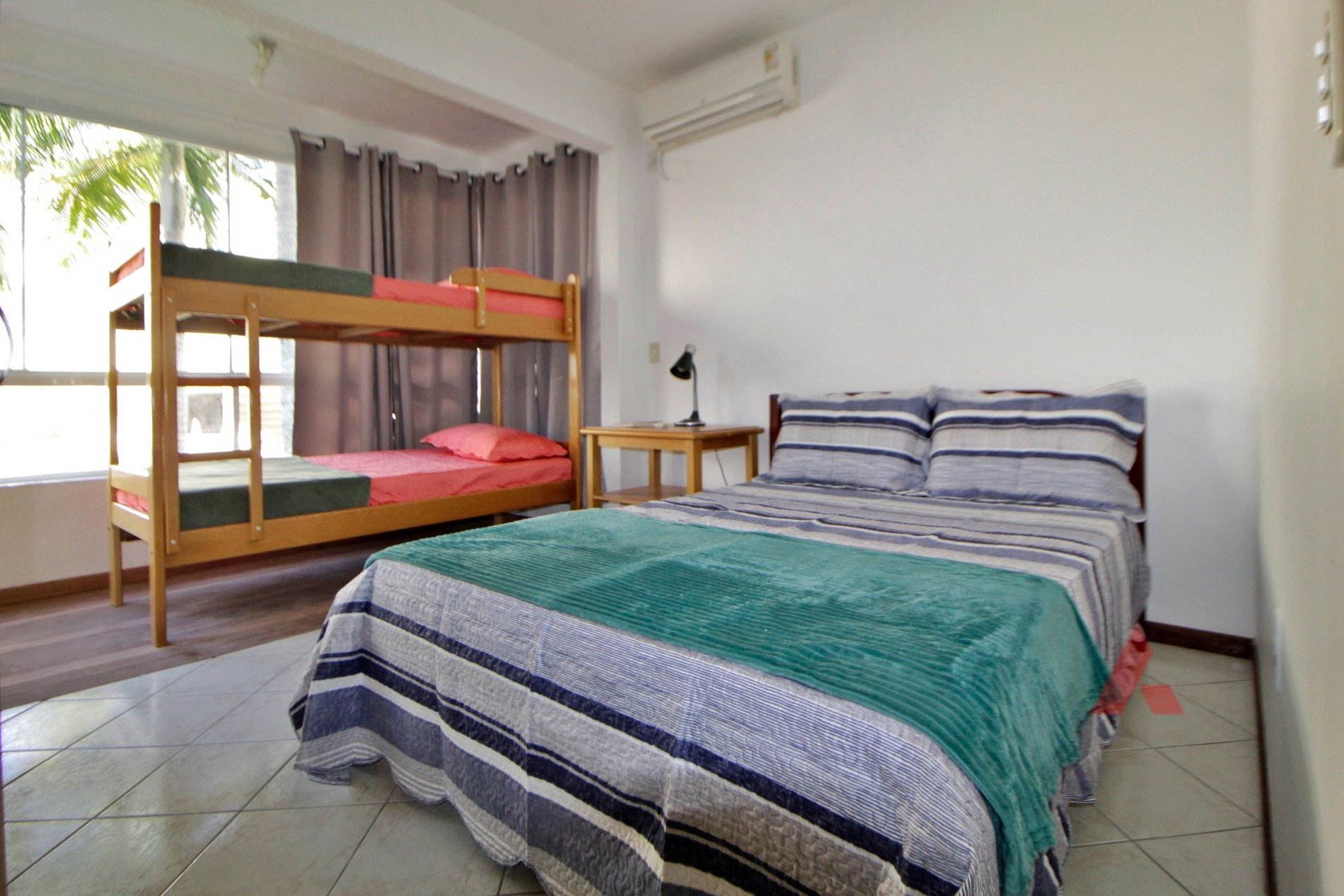 Mais um dormitório com cama de casal e um beliche, com ar condicionado, sacada fechada com blindex.