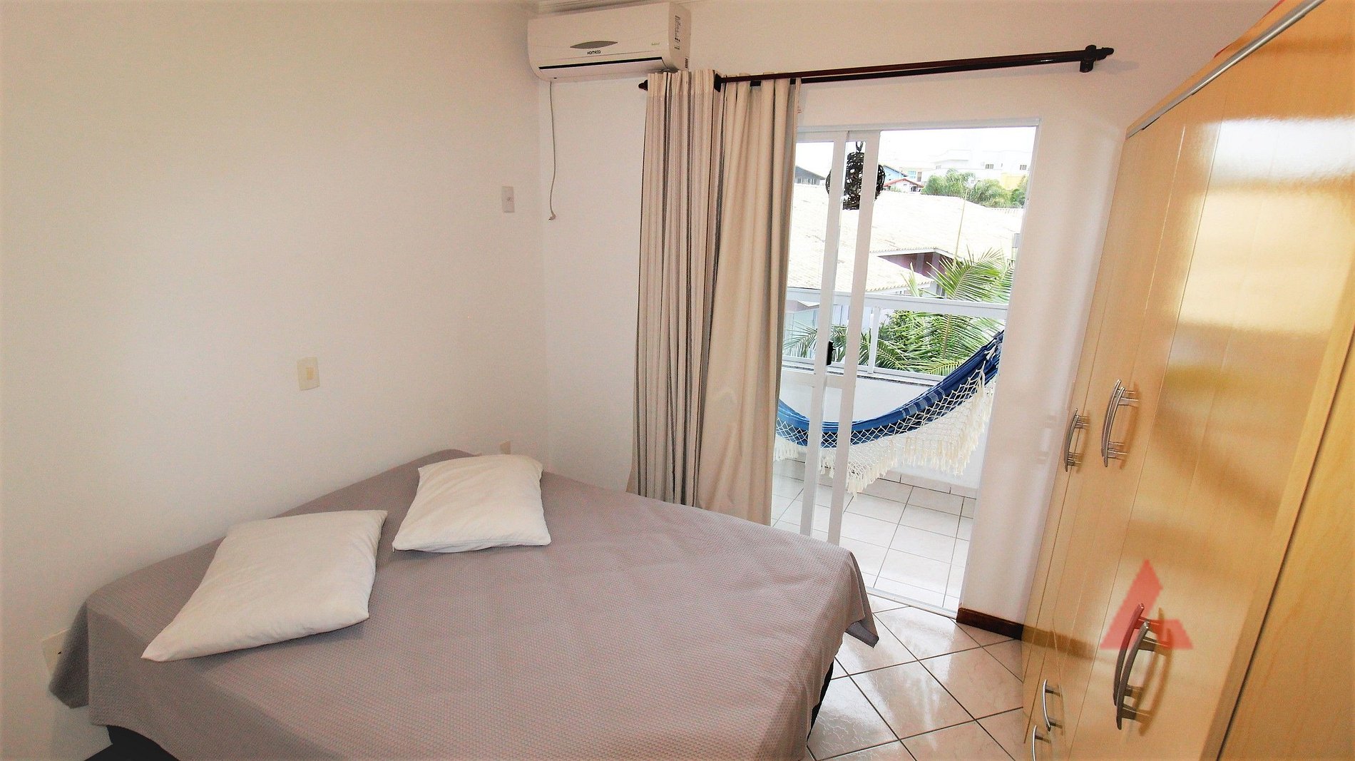 01 dormitório com cama de casal, ar condicionado, ventilador de teto, sacada e 01 colchão de solteiro.