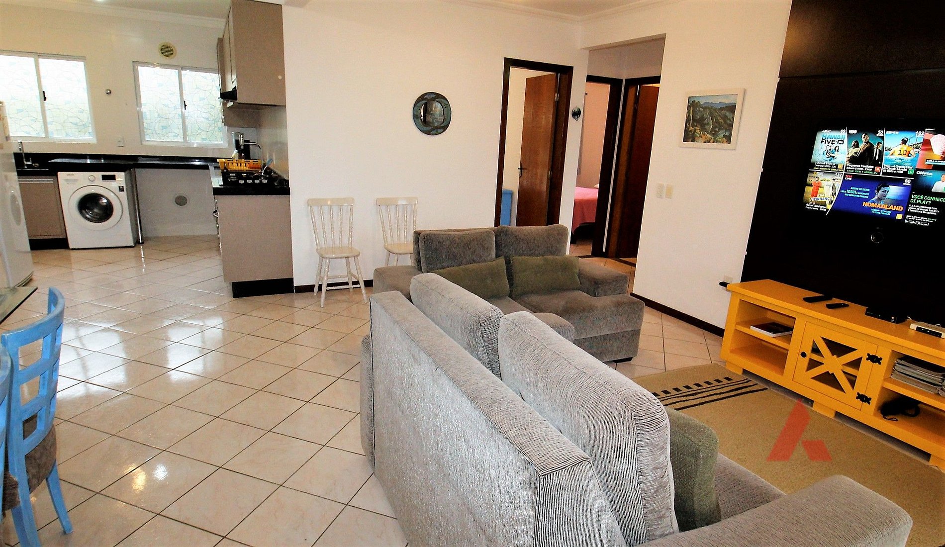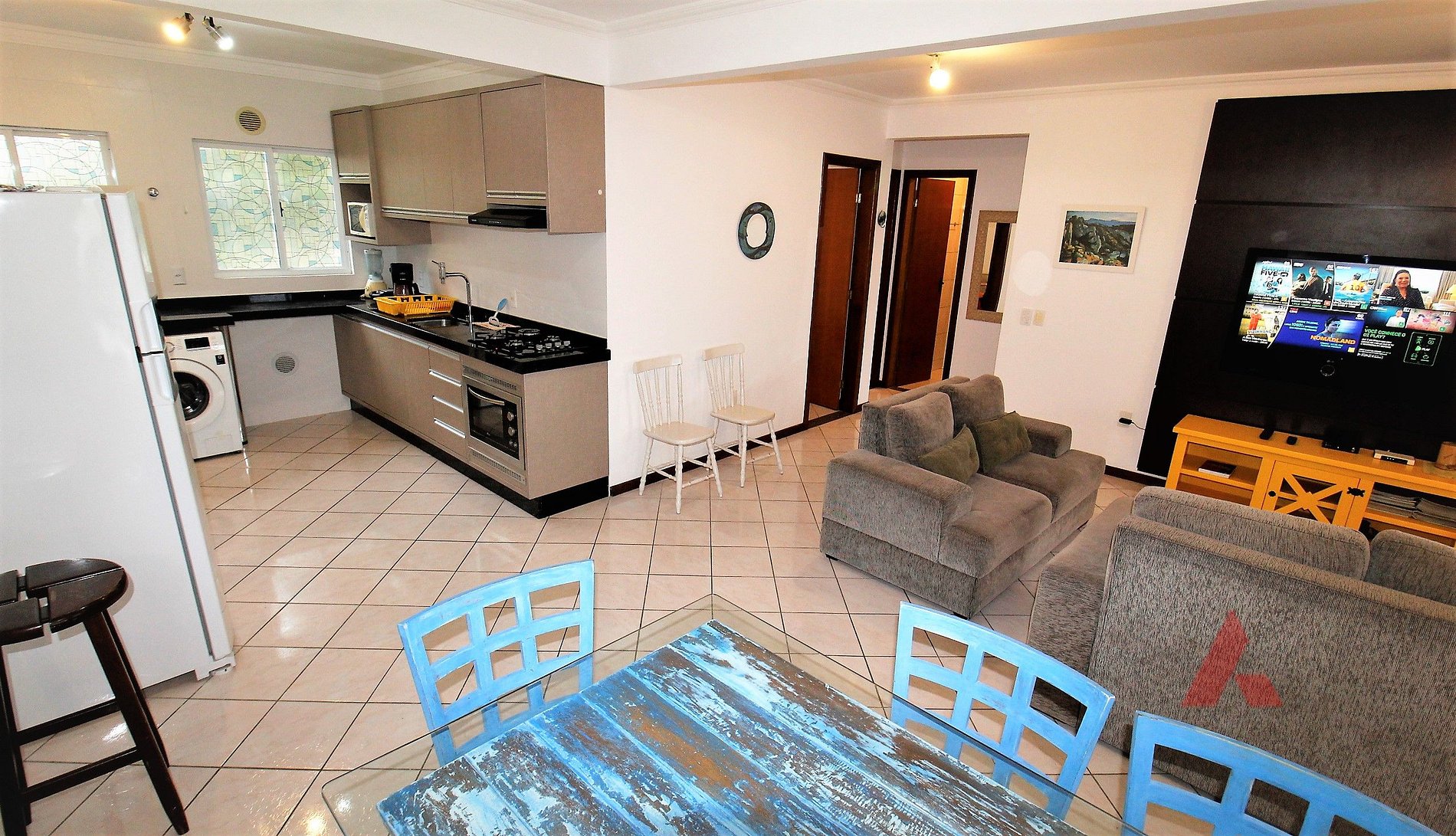 01 sala de estar e jantar ambientes conjugados, com tv canais via satélite, internet wi fi
