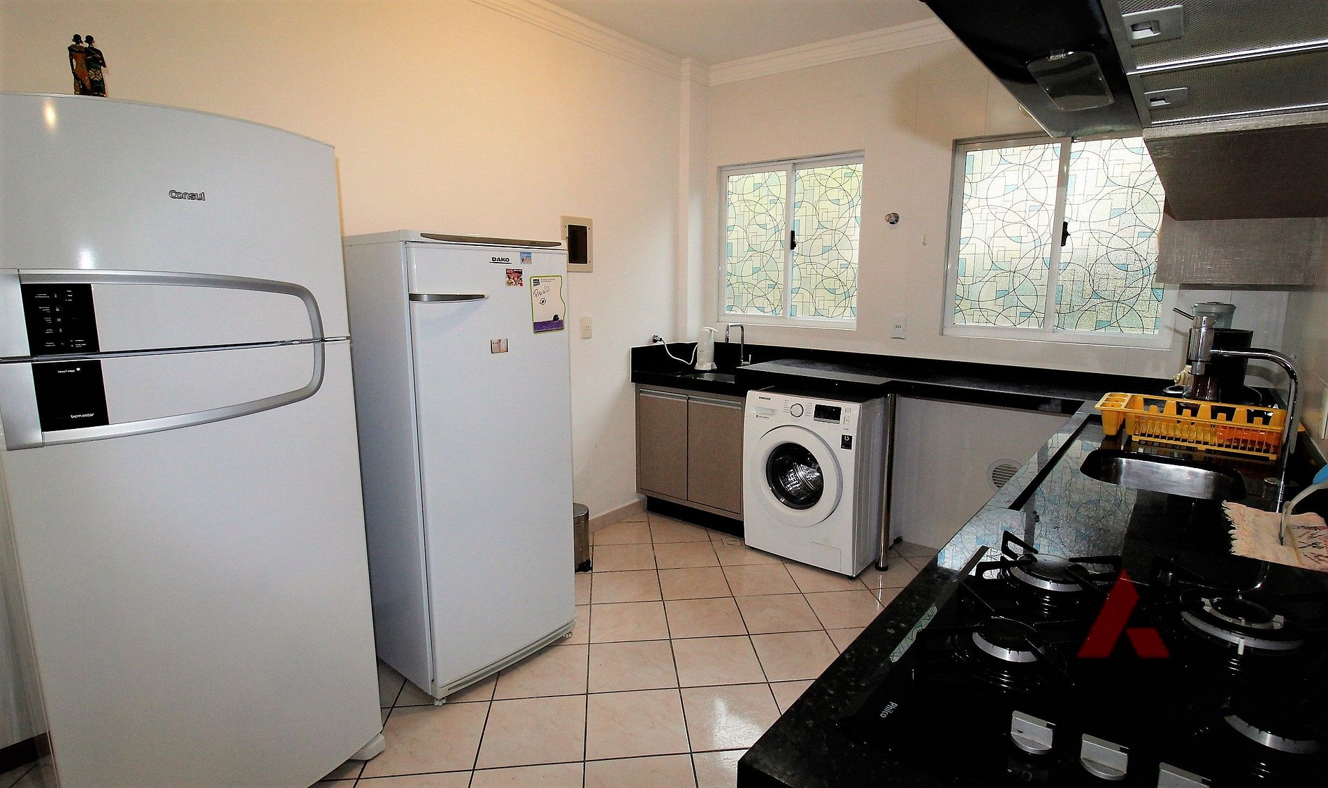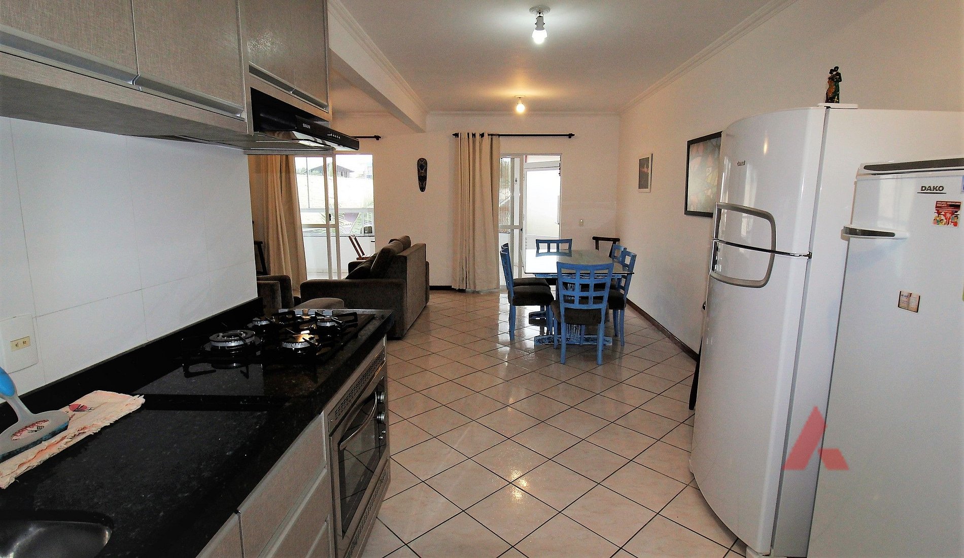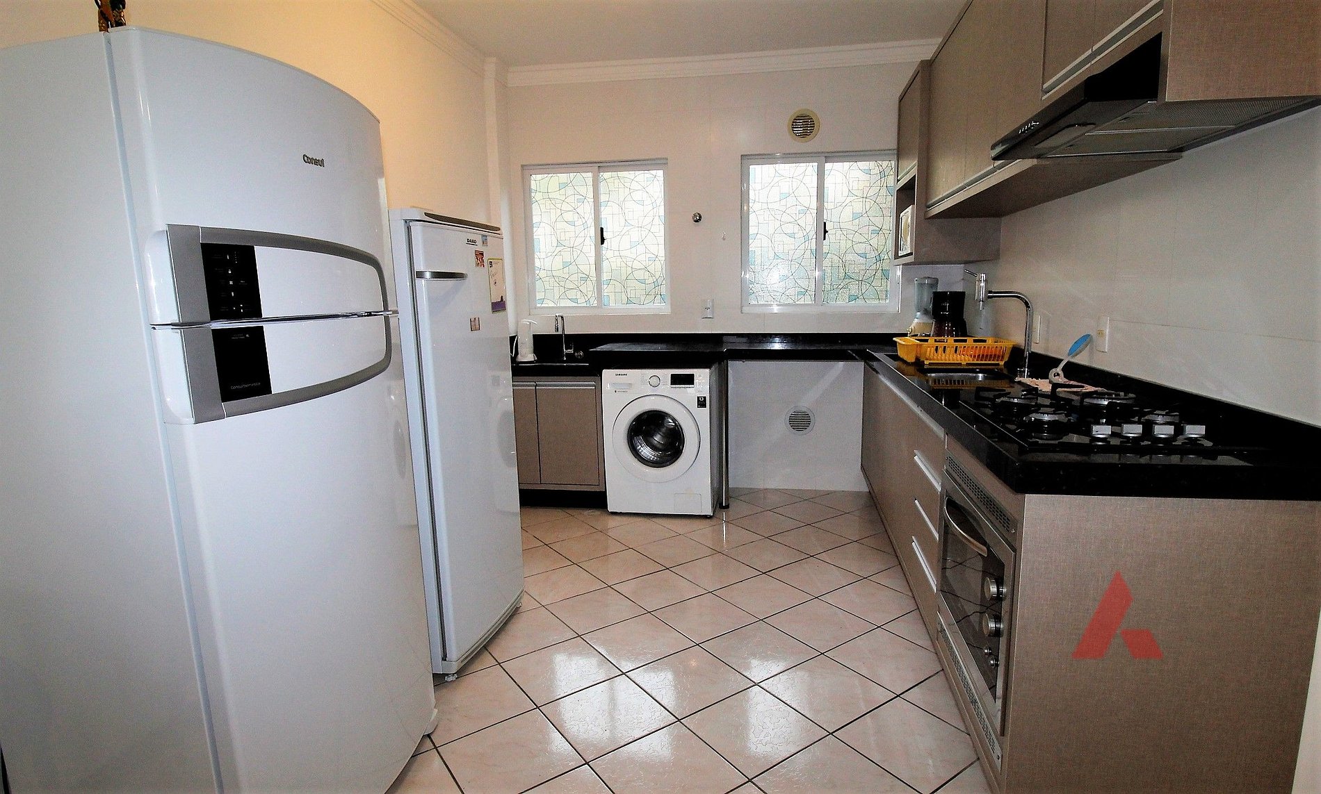 01 cozinha completa com micro ondas, fogão cook top, exaustor, geladeira duplex e freezer.