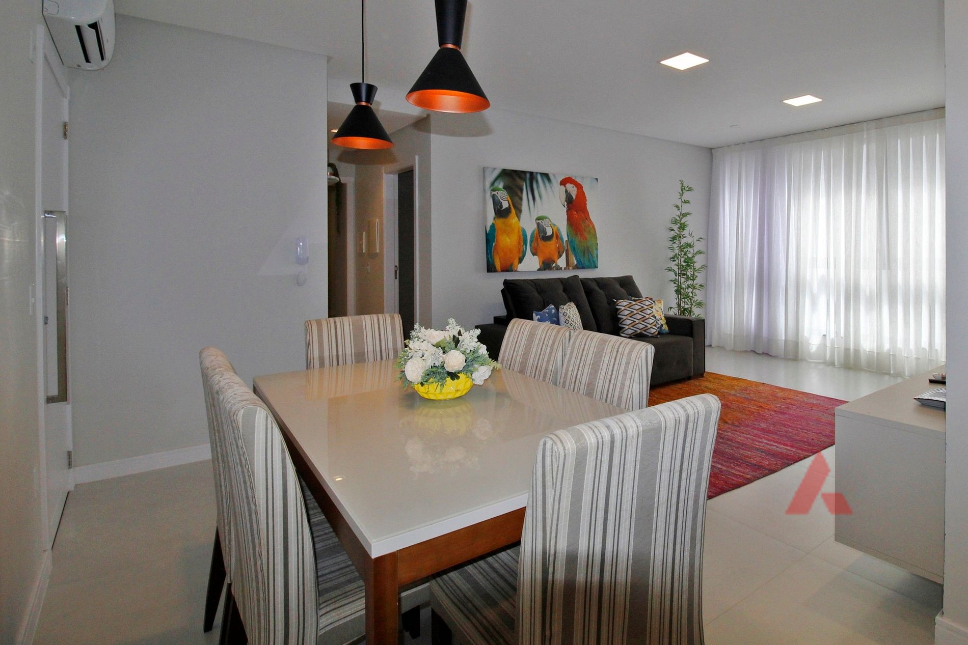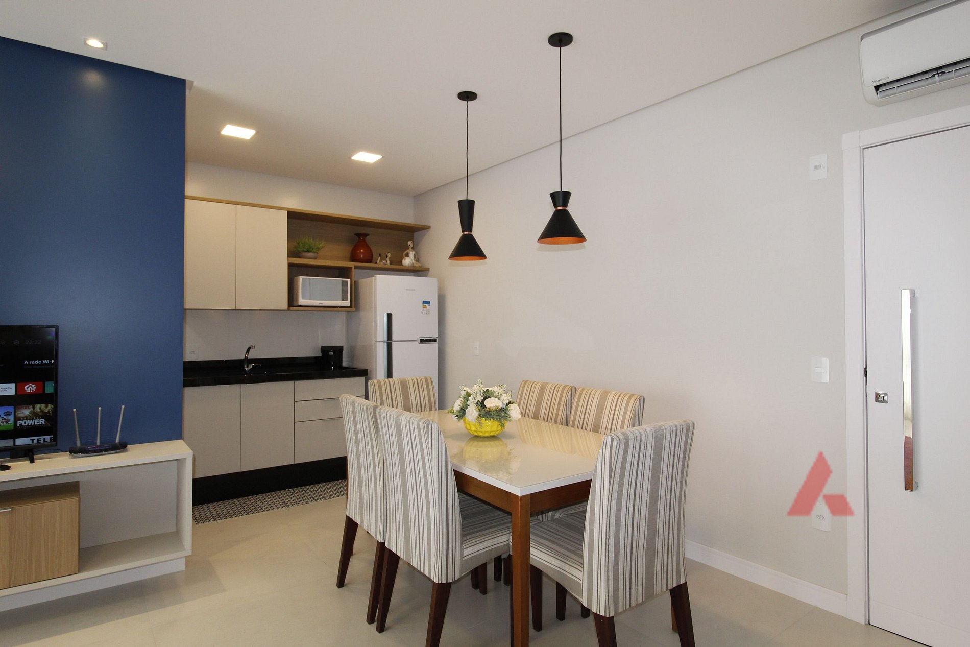 sala de estar e jantar integradas com TV e ar condicionado.