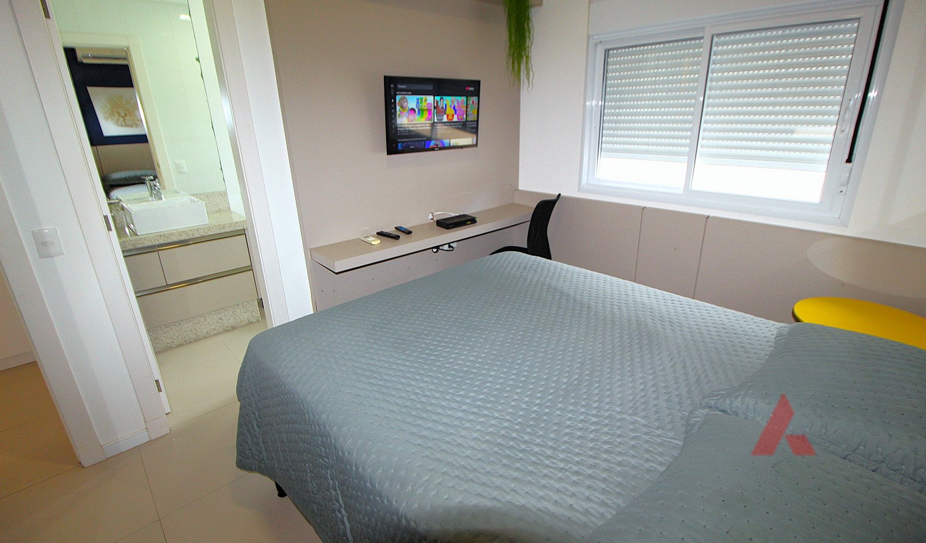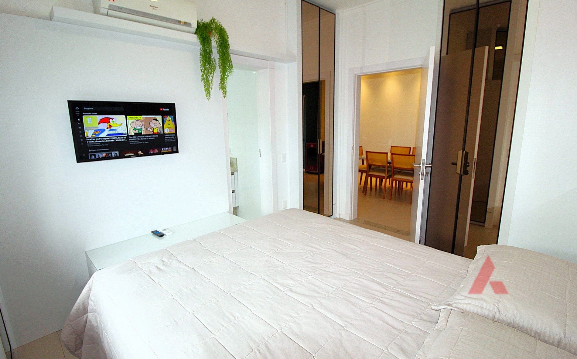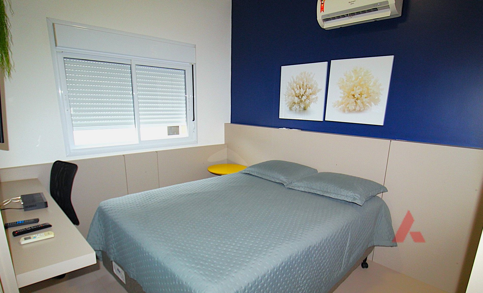 Uma suíte com cama box de casal com ar condicionado tipo split e tv.