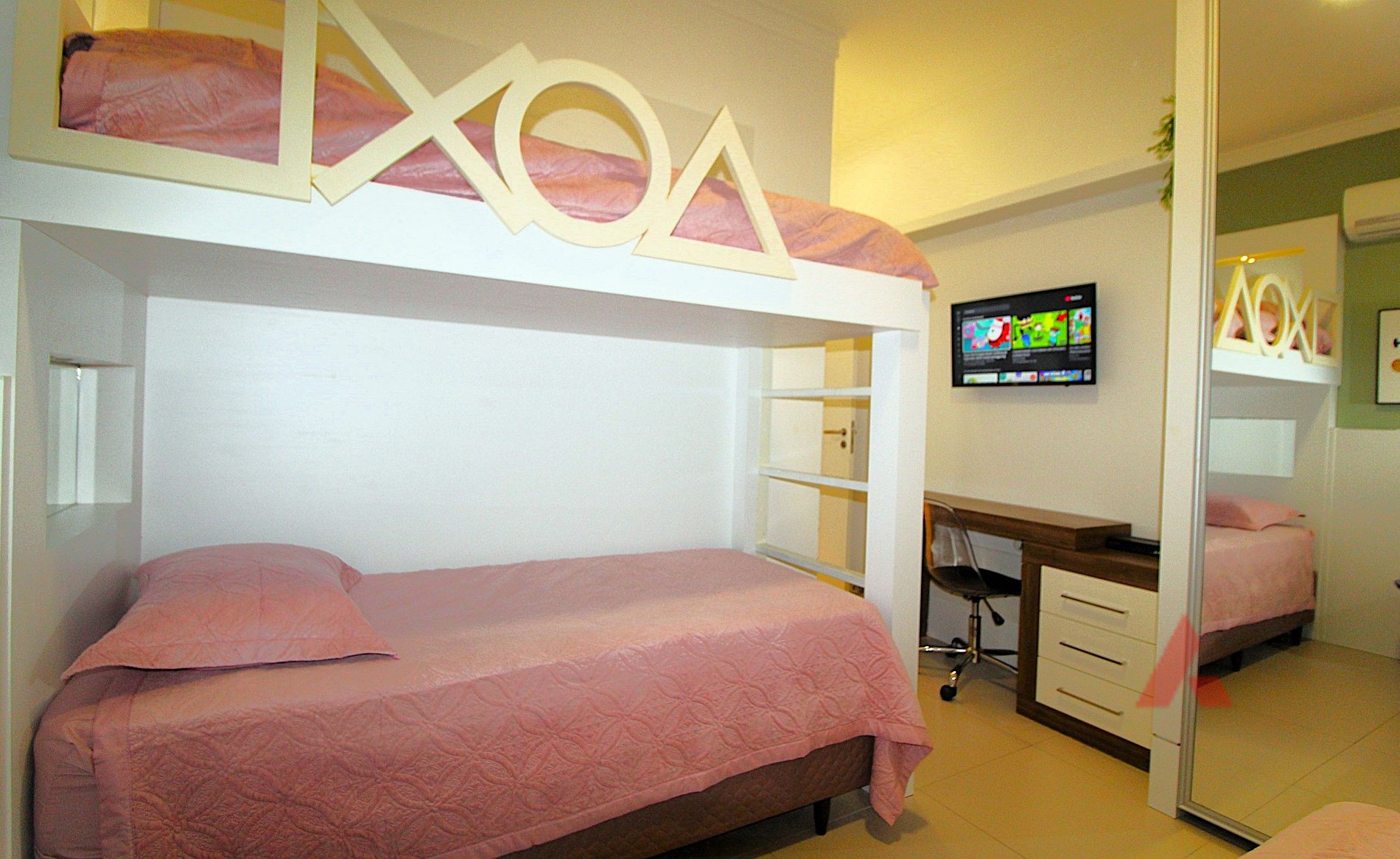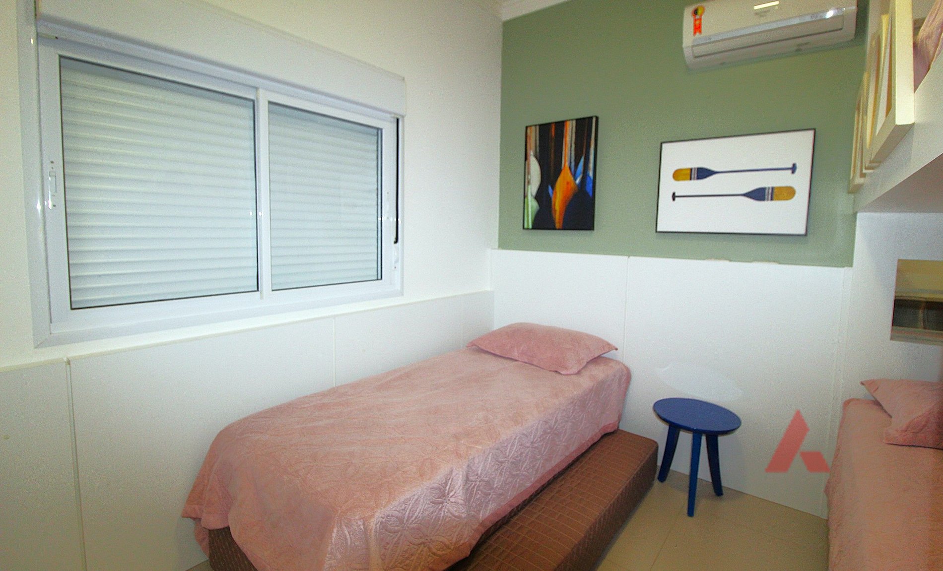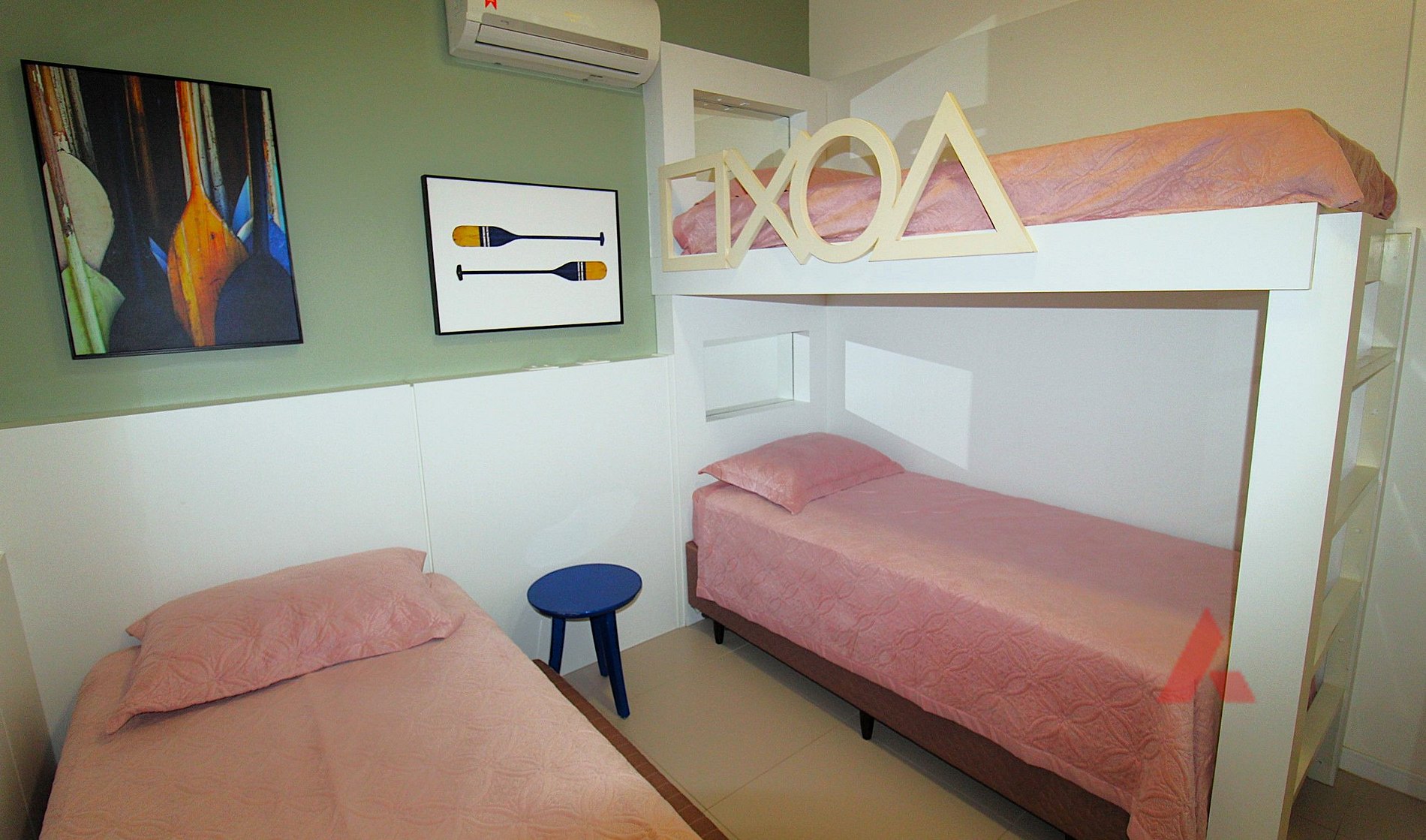 Uma suíte com uma cama box de solteiro, uma beliche e uma cama auxiliar, com ar condicionado tipo split e tv.