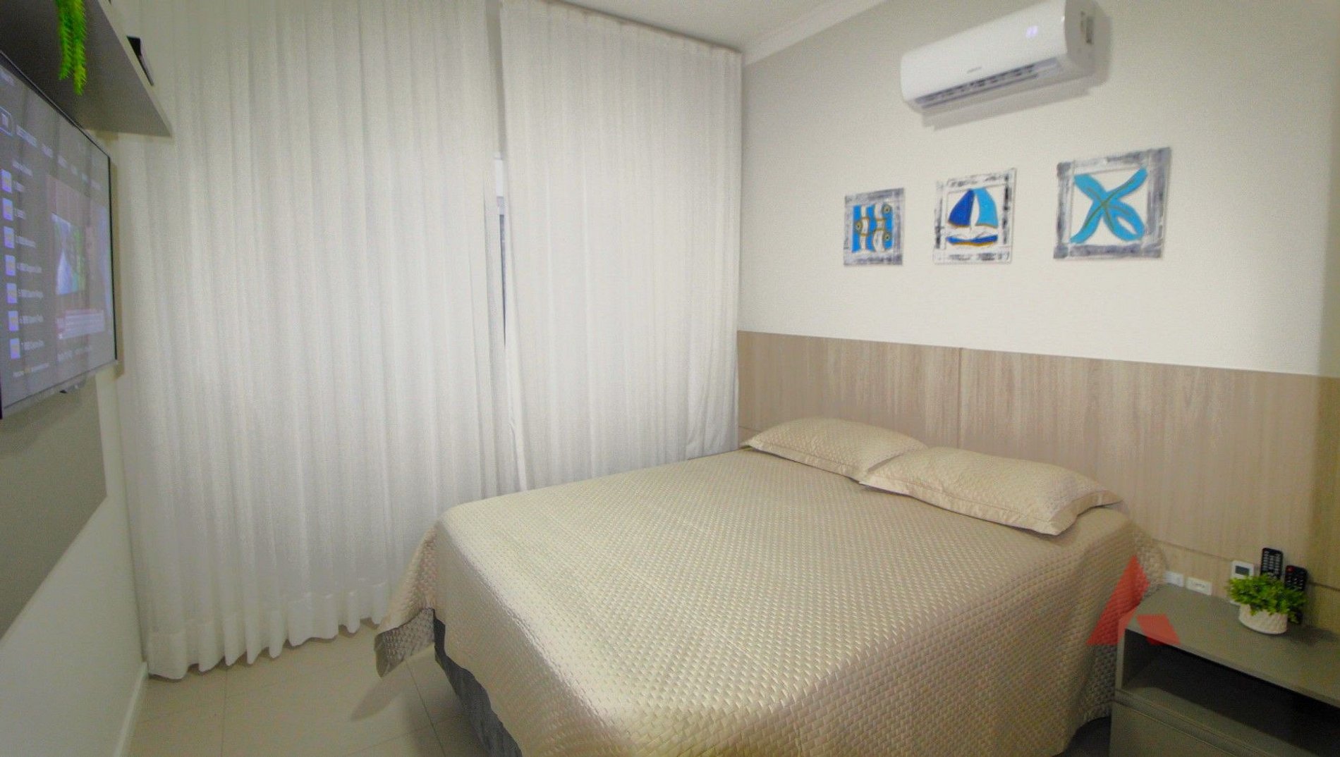 Uma Suíte com cama de casal padrão Queen size e ar condicionado e televisor