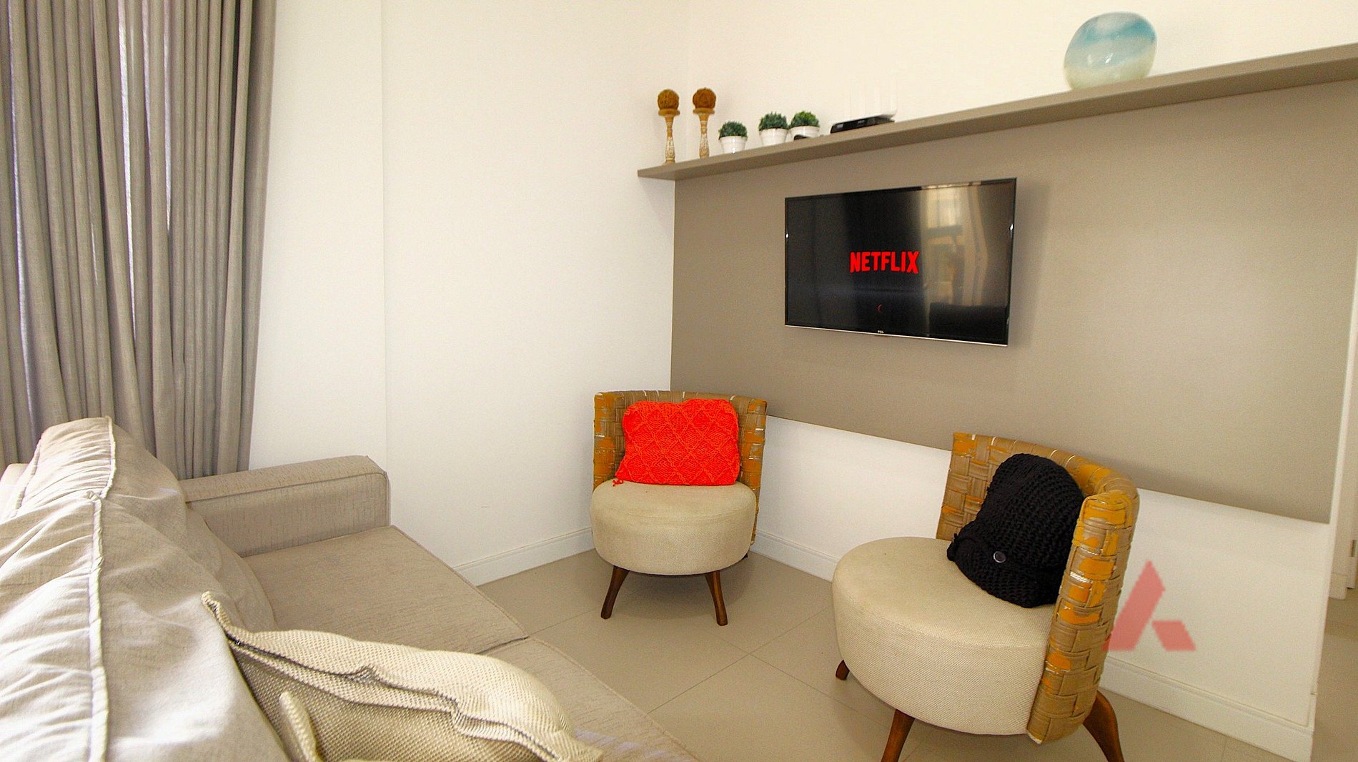 Uma sala de estar e jantar com televisor, ar condicionado tipo split e internet wi fi.