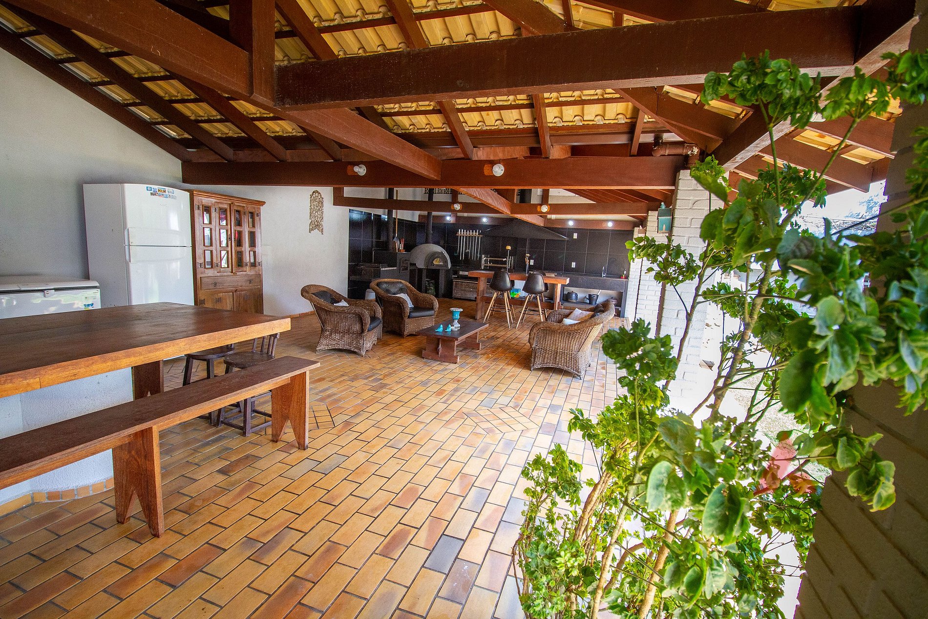 Geladeira, freezer, fogão e forno a lenha, forno de pizza, churrasqueira e fogão industrial;