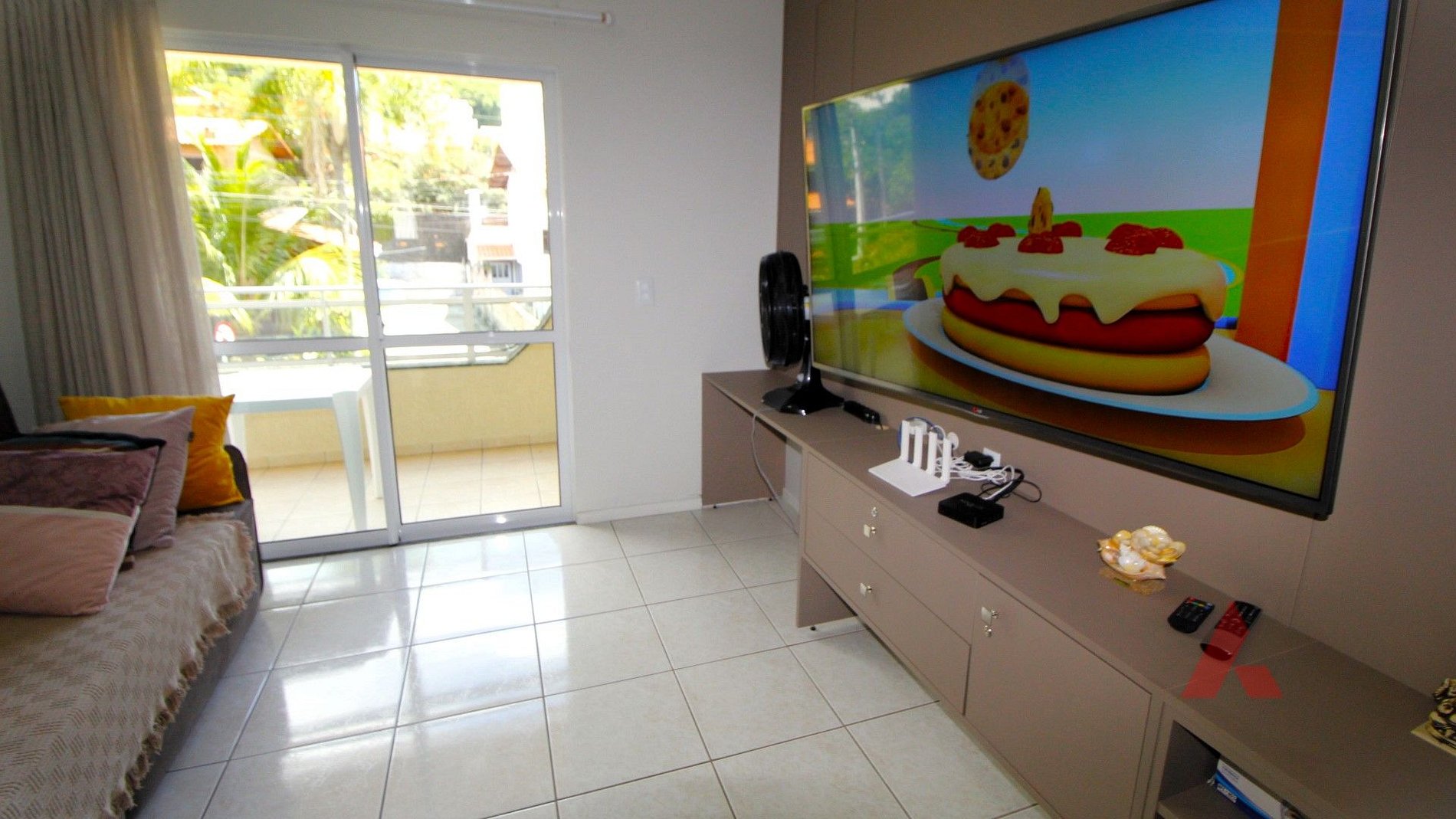 Sala de estar e jantar com tv e internet wi fi, e uma sofá cama de casal.