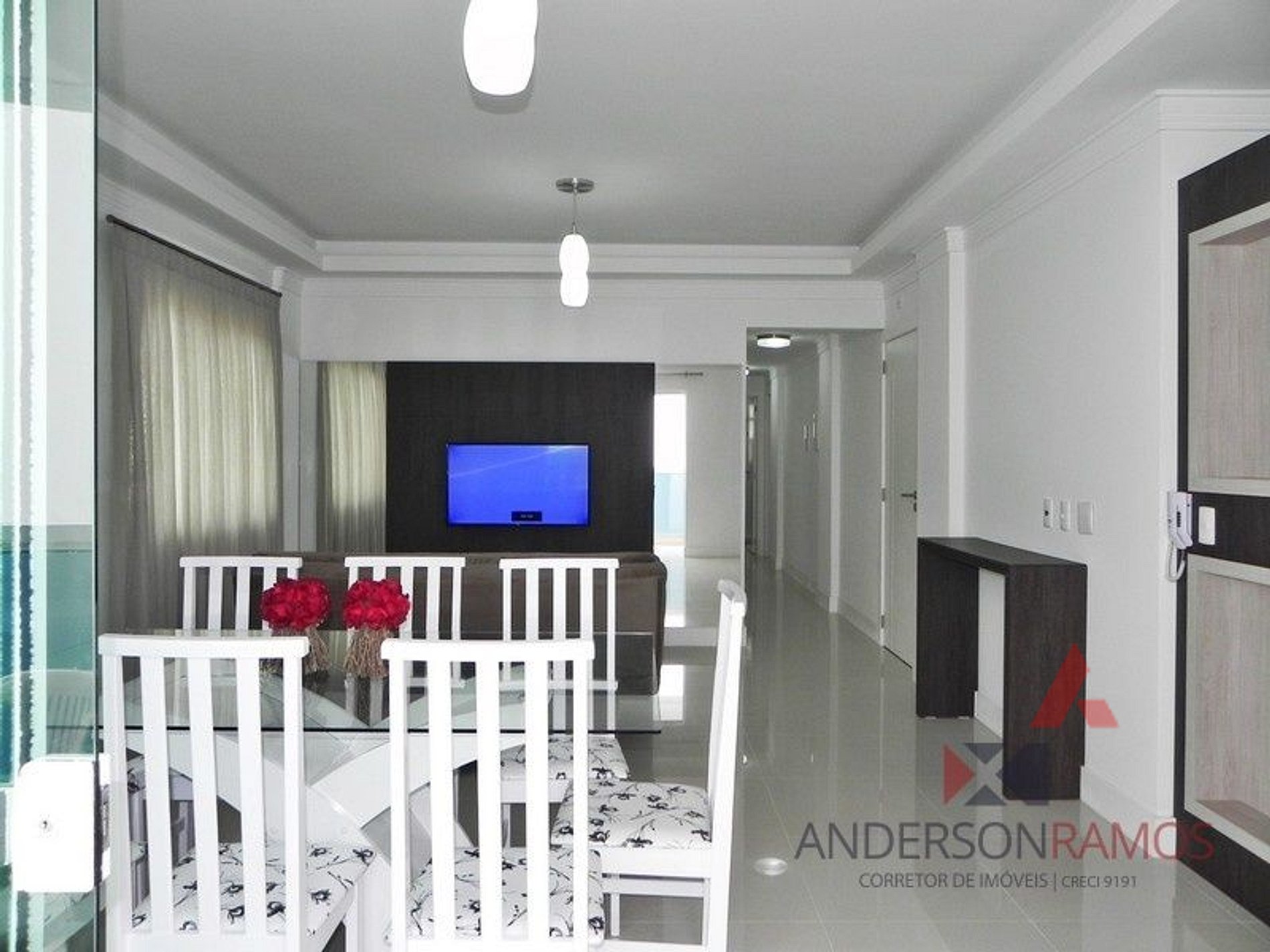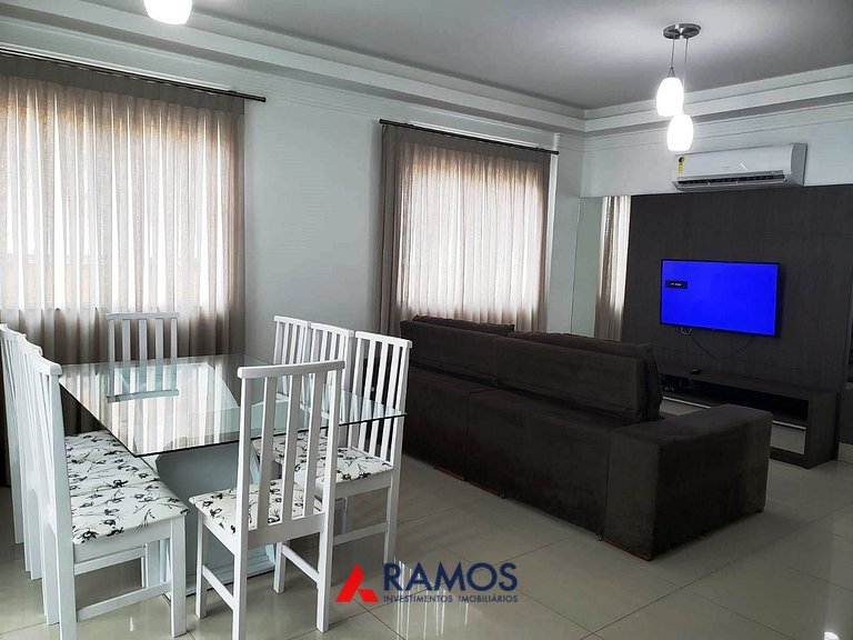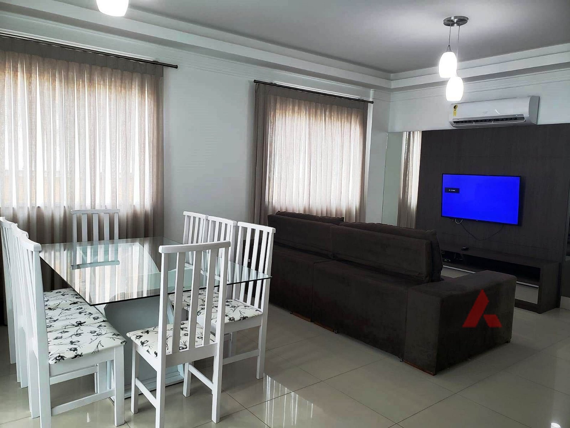 Sala de estar e jantar, com tv e ar condicionado.