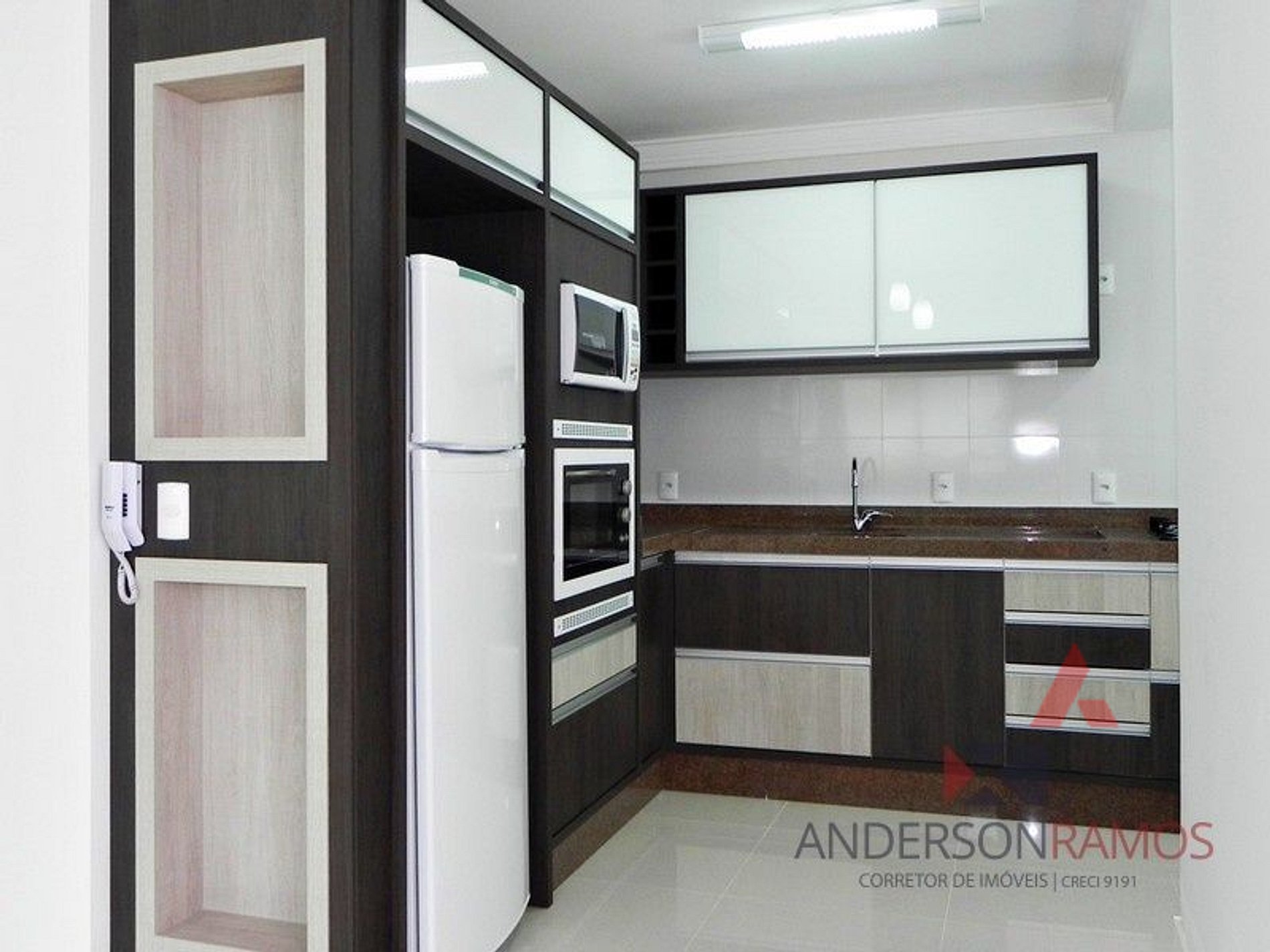 Cozinha equipada com micro ondas e demais utensílios domésticos.