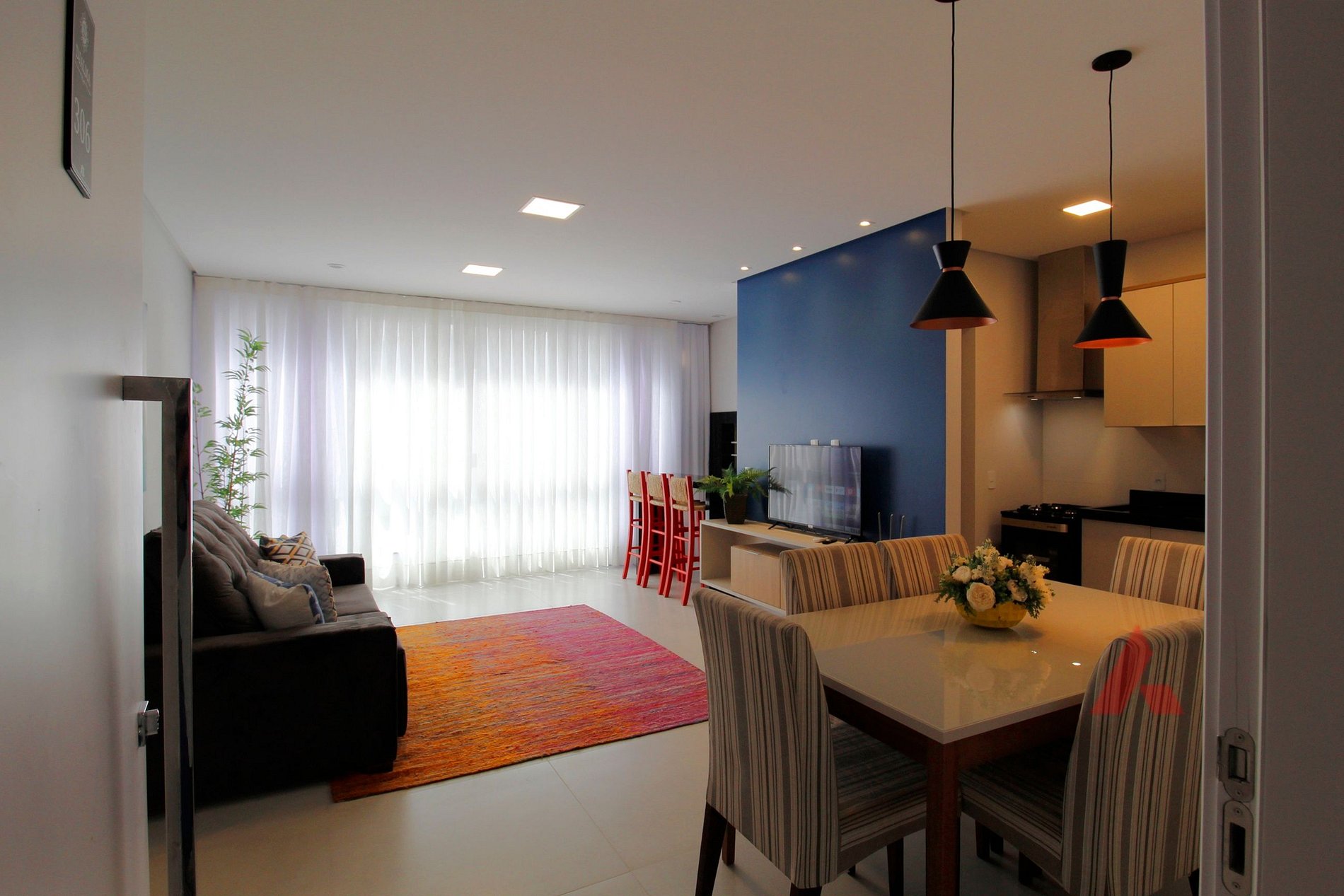sala de estar e jantar integradas com TV e ar condicionado.