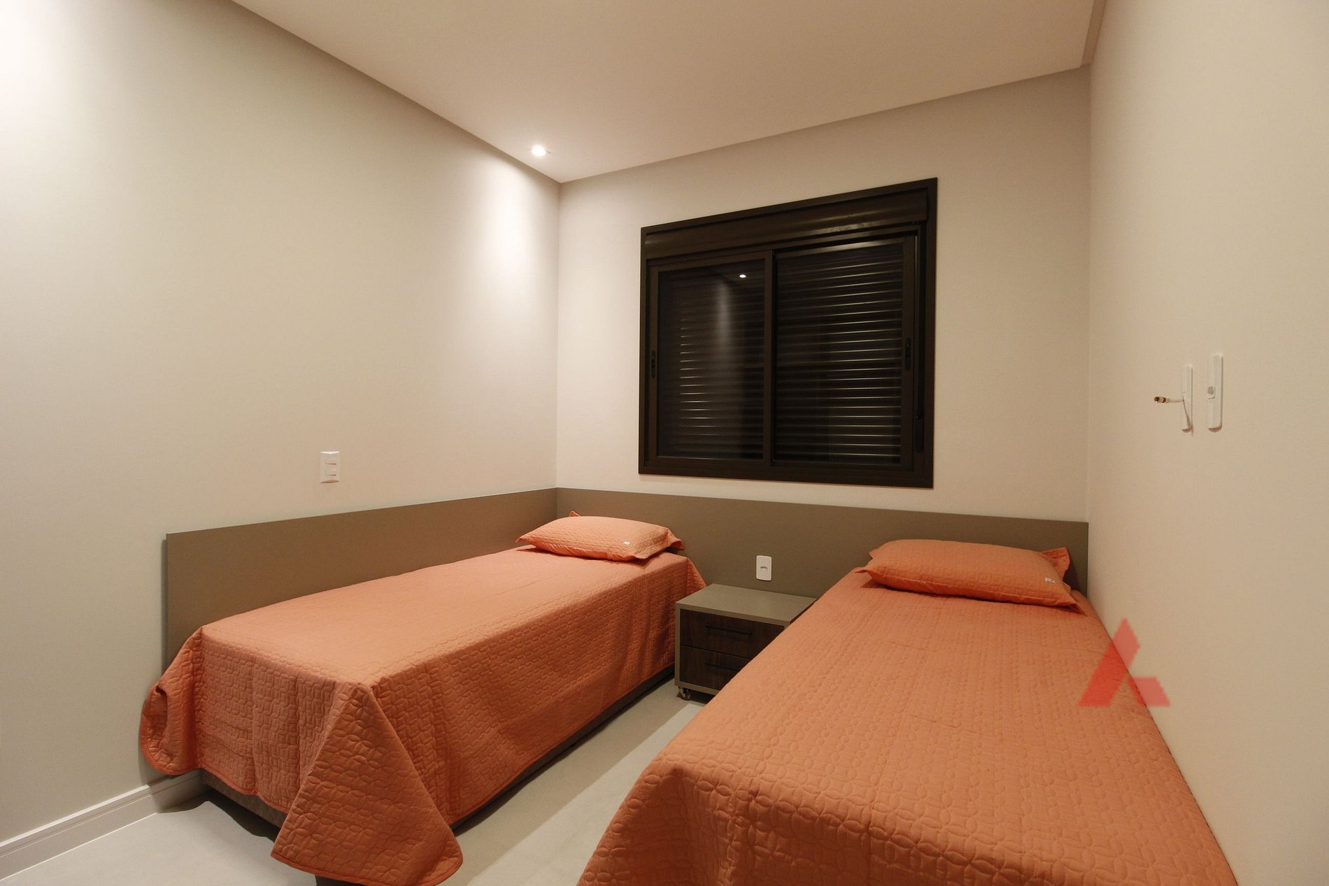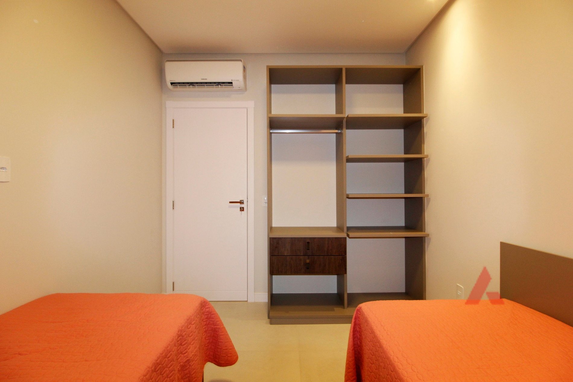 Um dormitório com 02 camas box de solteiro, uma cama auxiliar com ar condicionado.