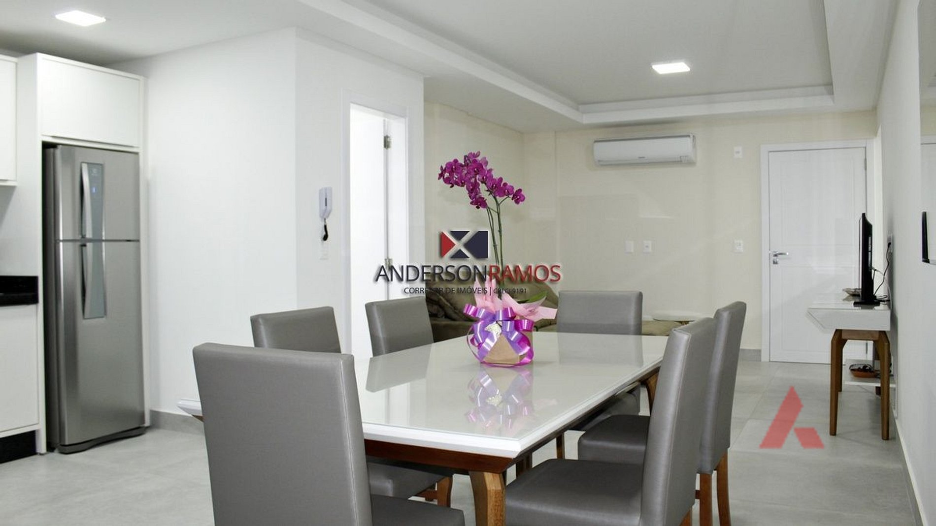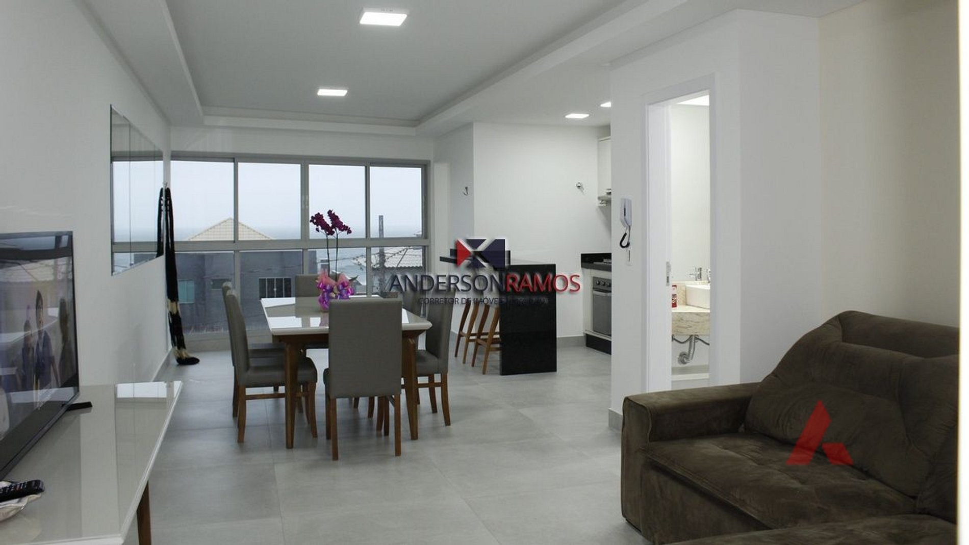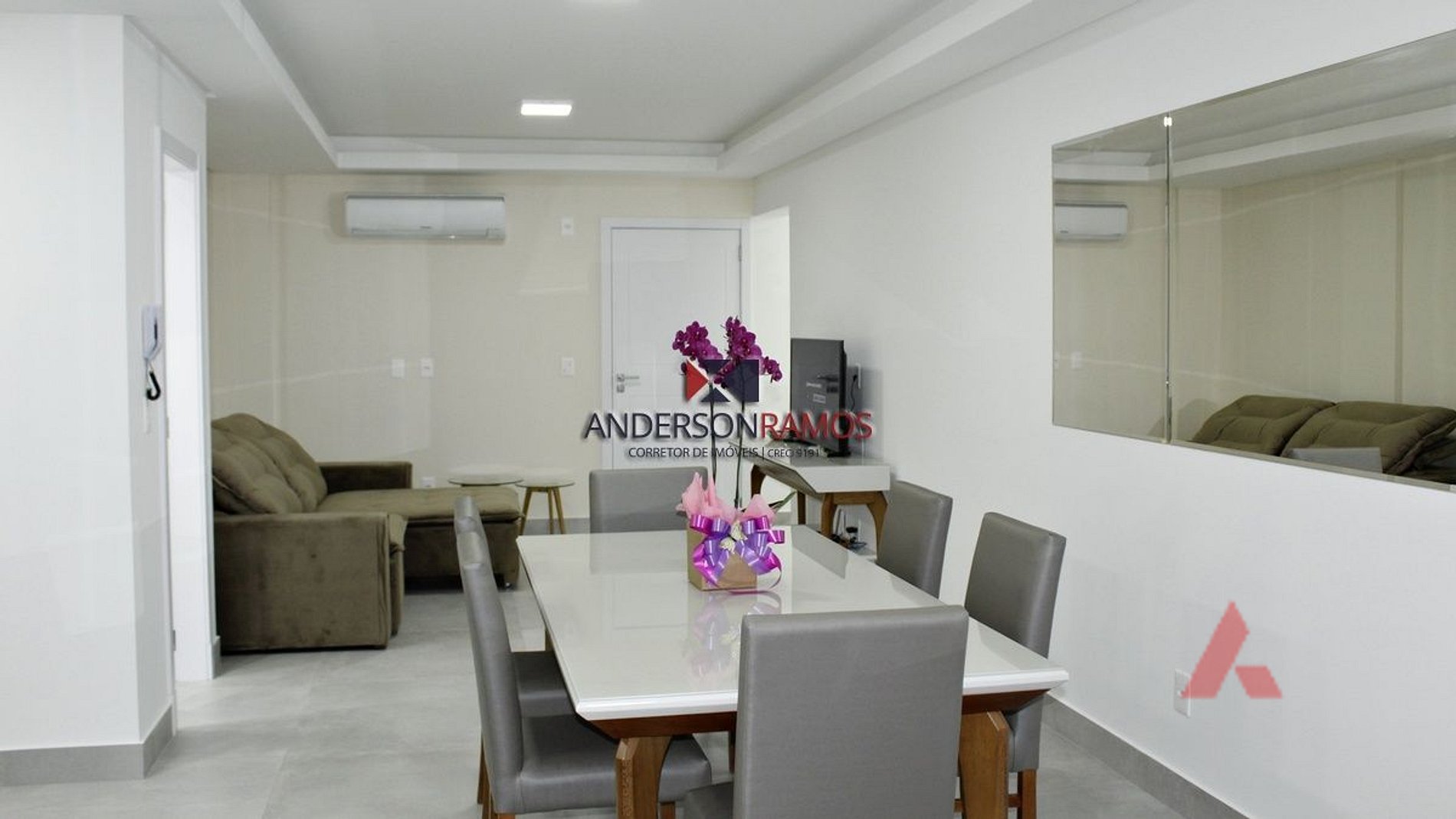 Sala de estar e jantar com sofá retrátil e tv, ambiente climatizado.