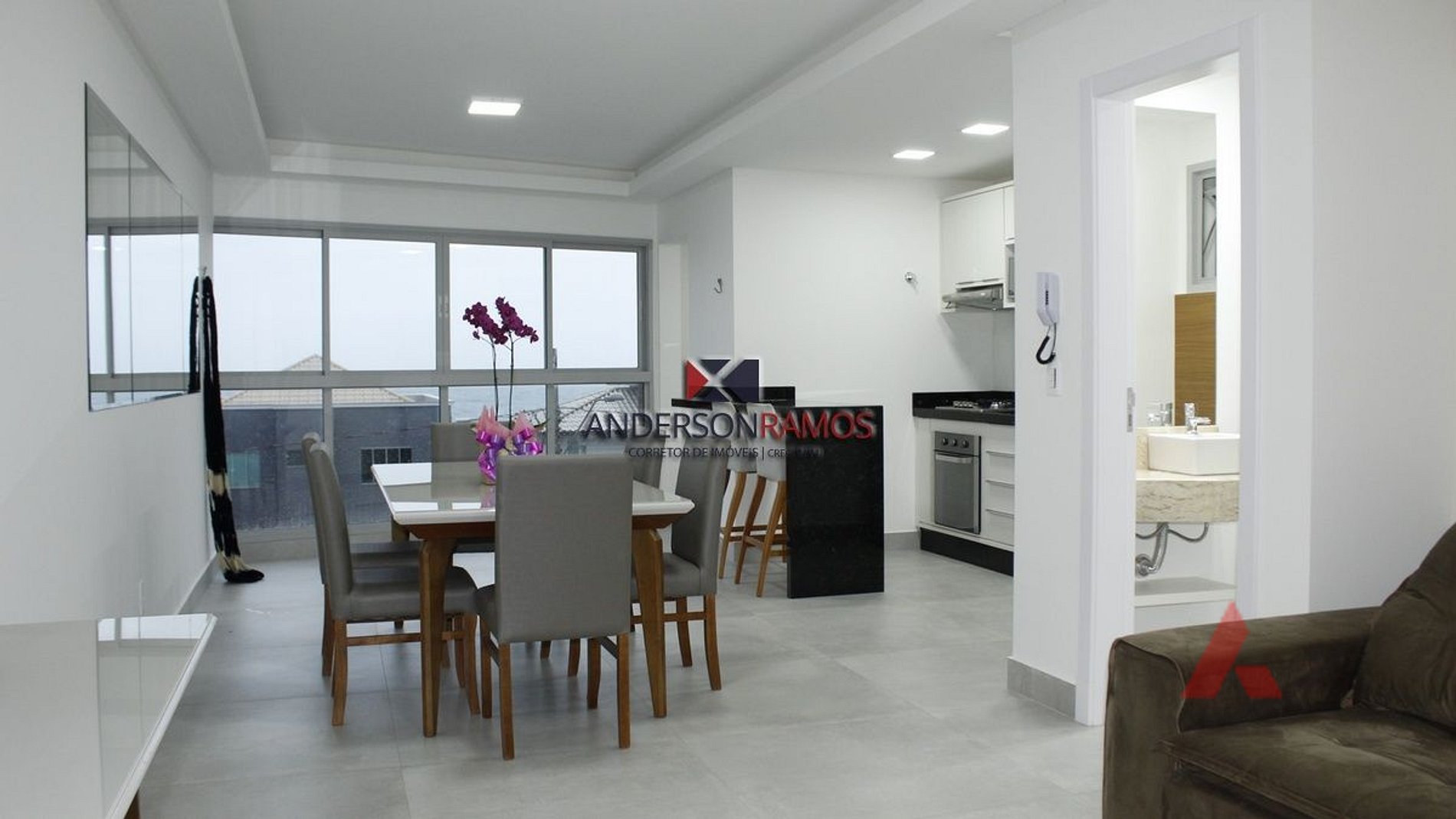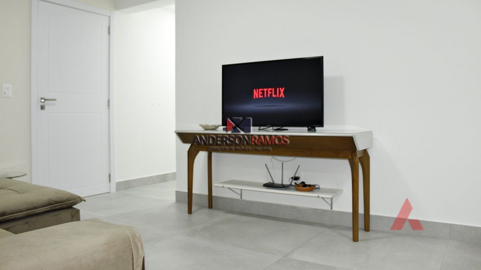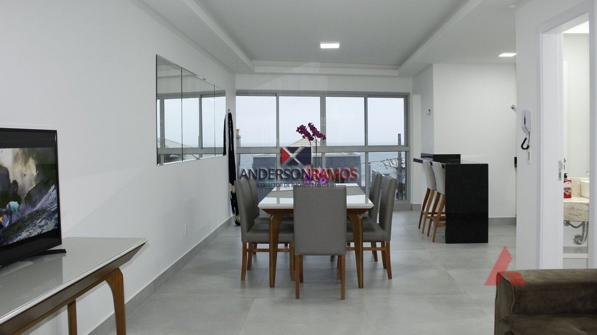 Sala de estar e jantar com sofá retrátil e tv, ambiente climatizado.