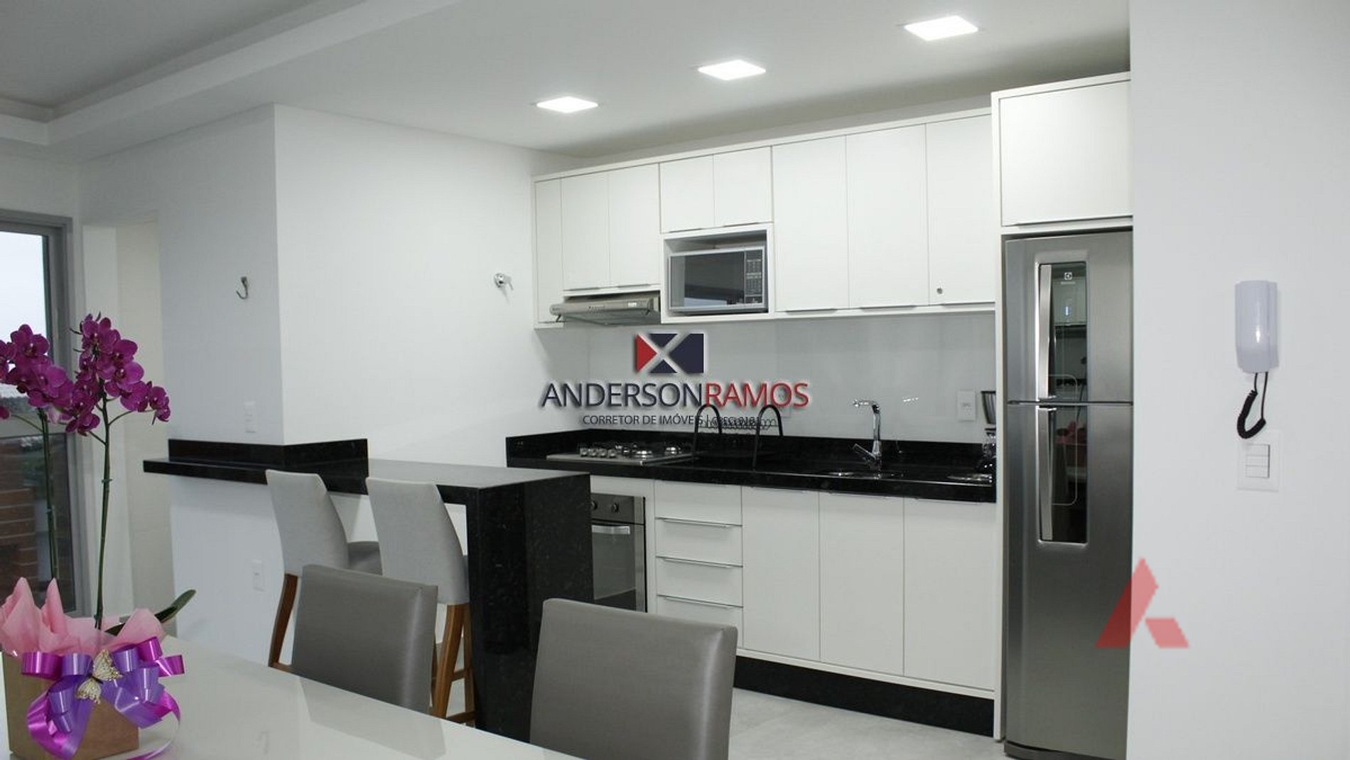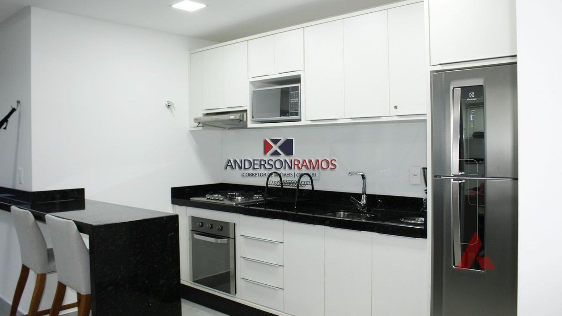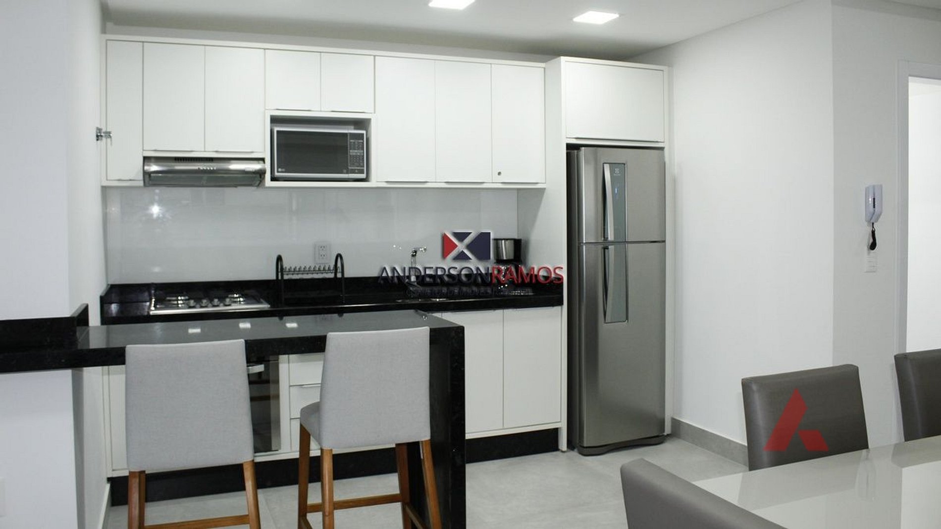 Cozinha completa com micro ondas e mais utensílios domésticos.