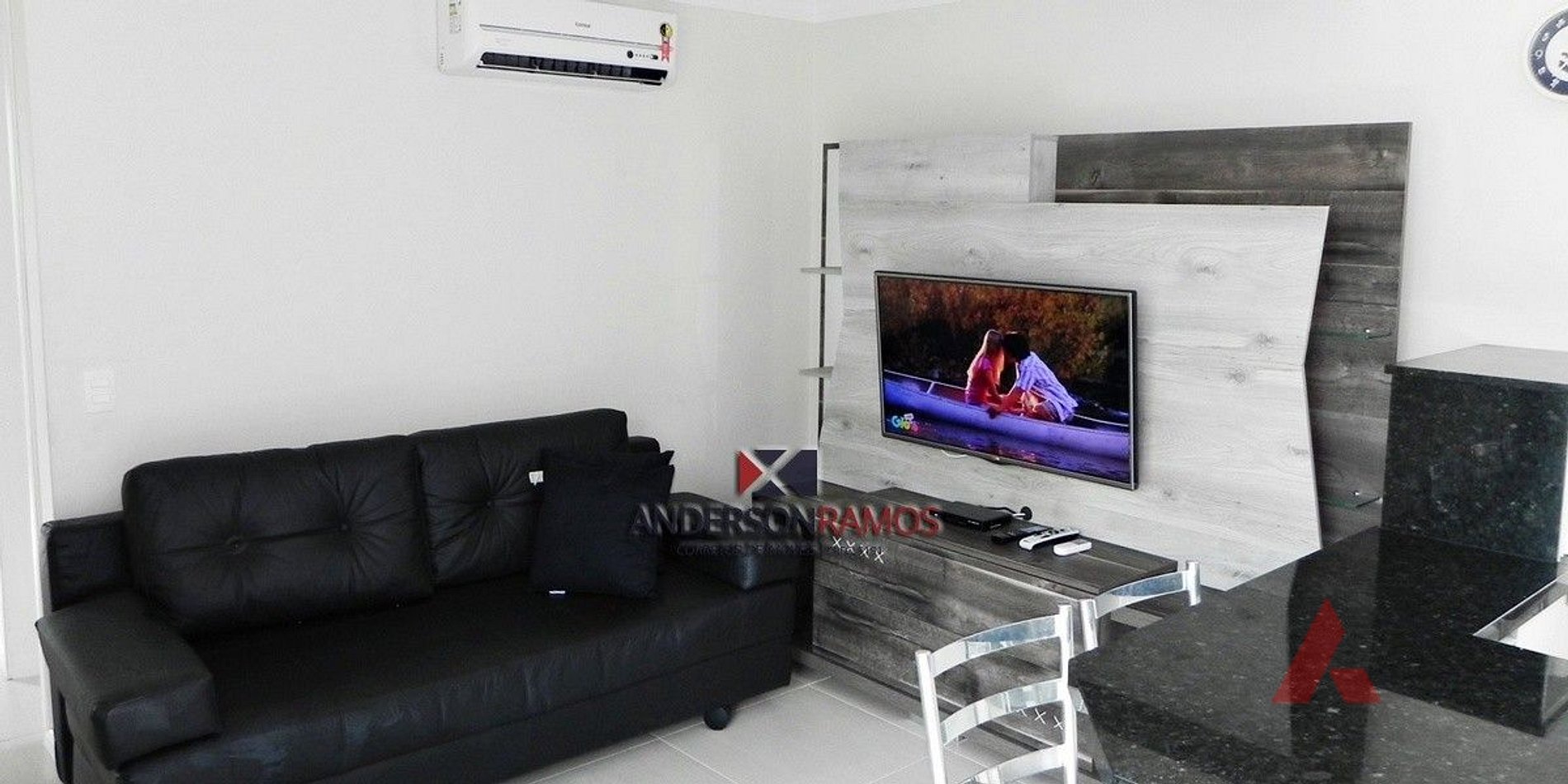 Sala com ar-condicionado, sofá-cama, TV com canais por assinatura.