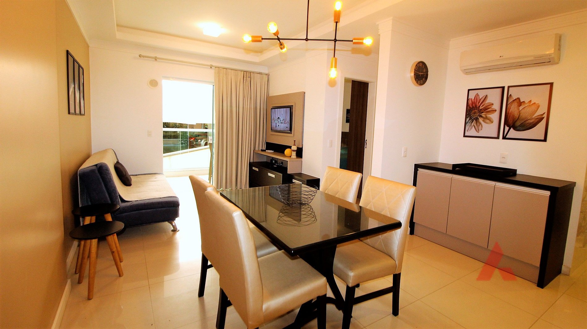 Sala com ar-condicionado, sofá-cama, TV.
