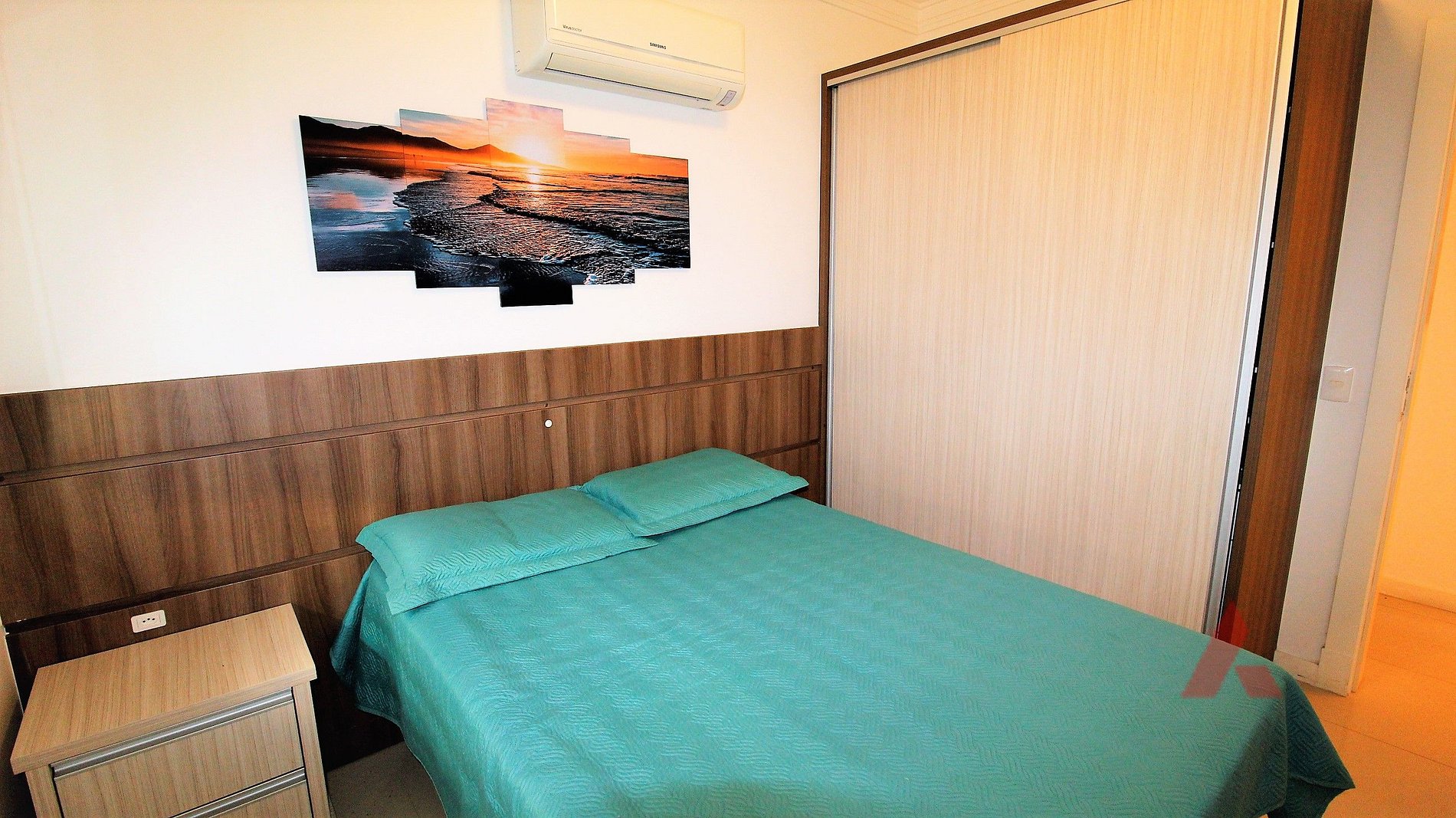 Um dormitório com cama box de casal e ar-condicionado.