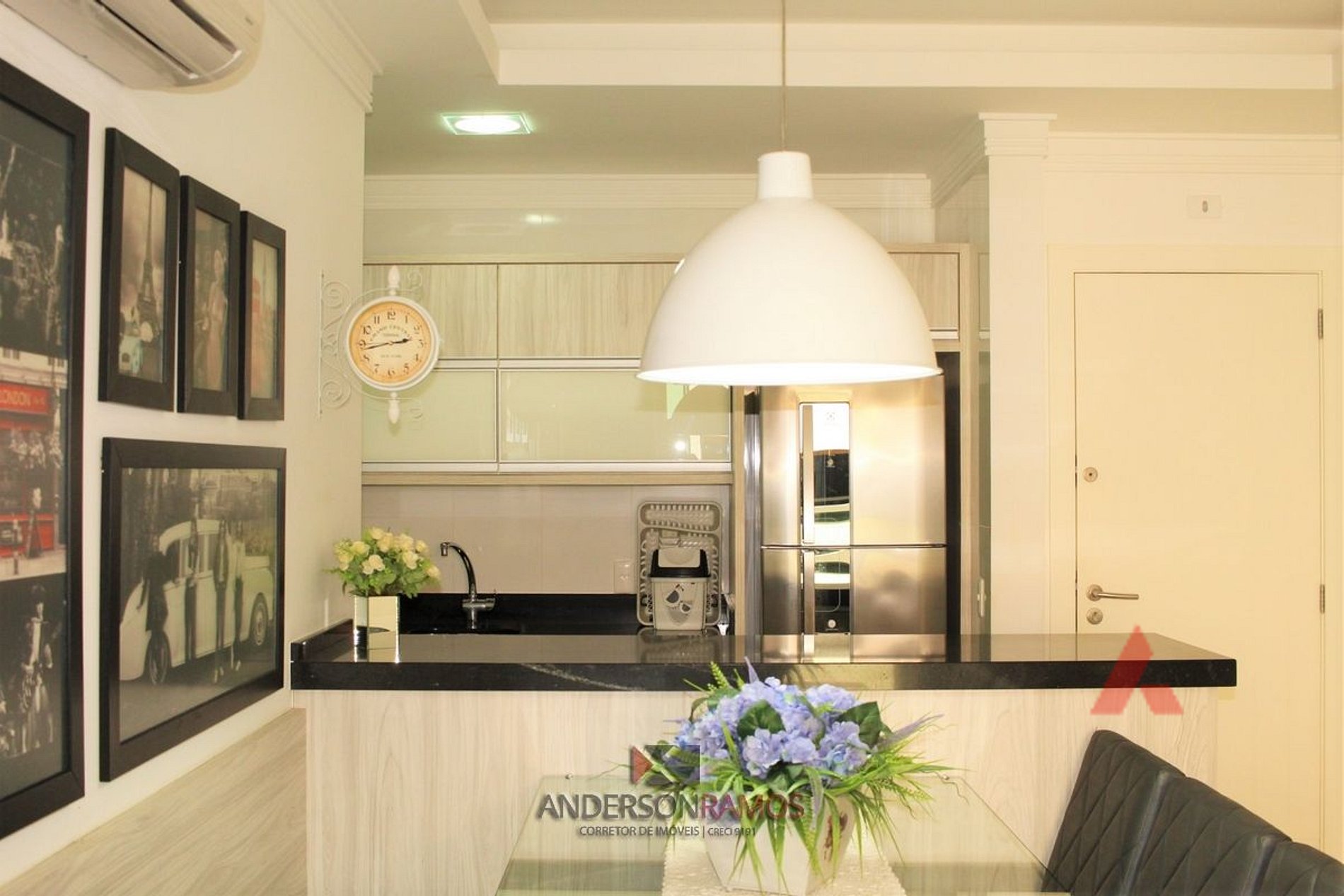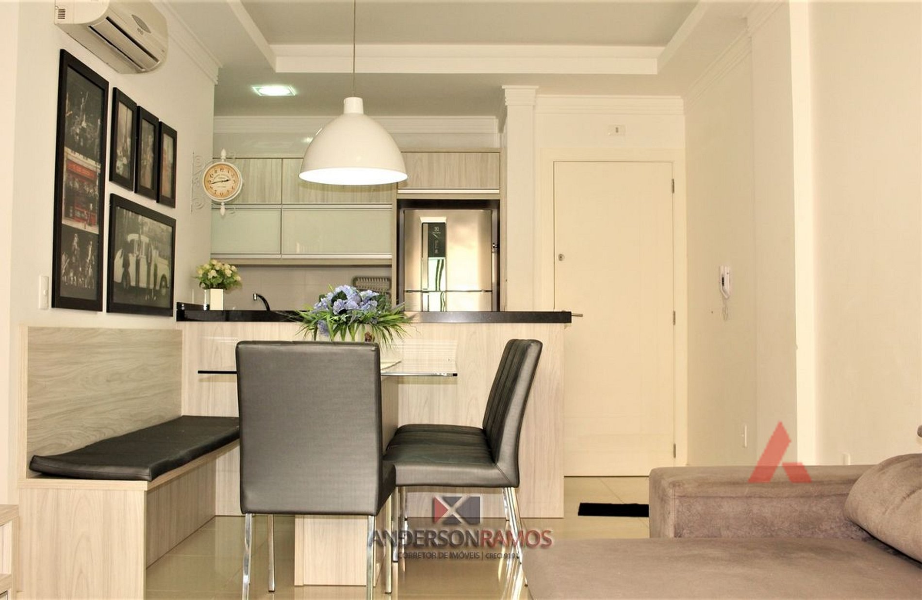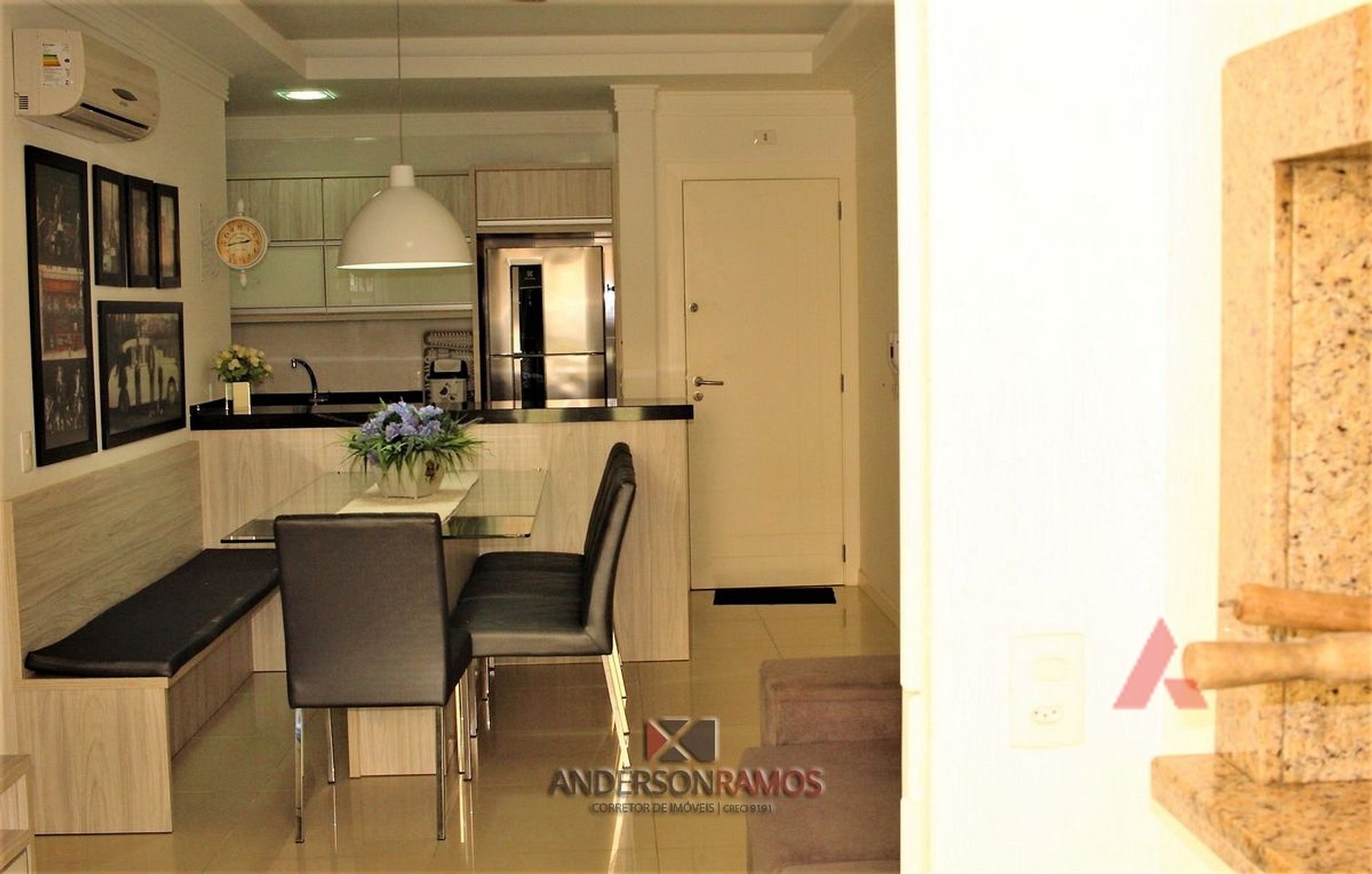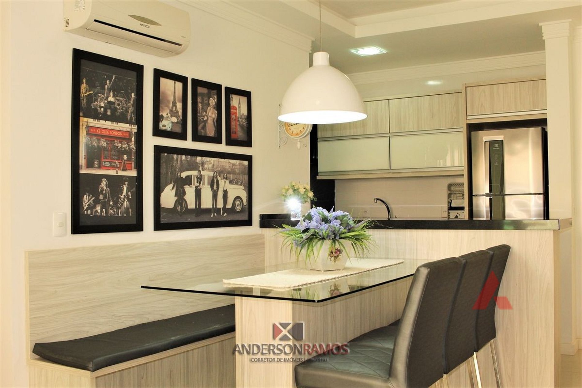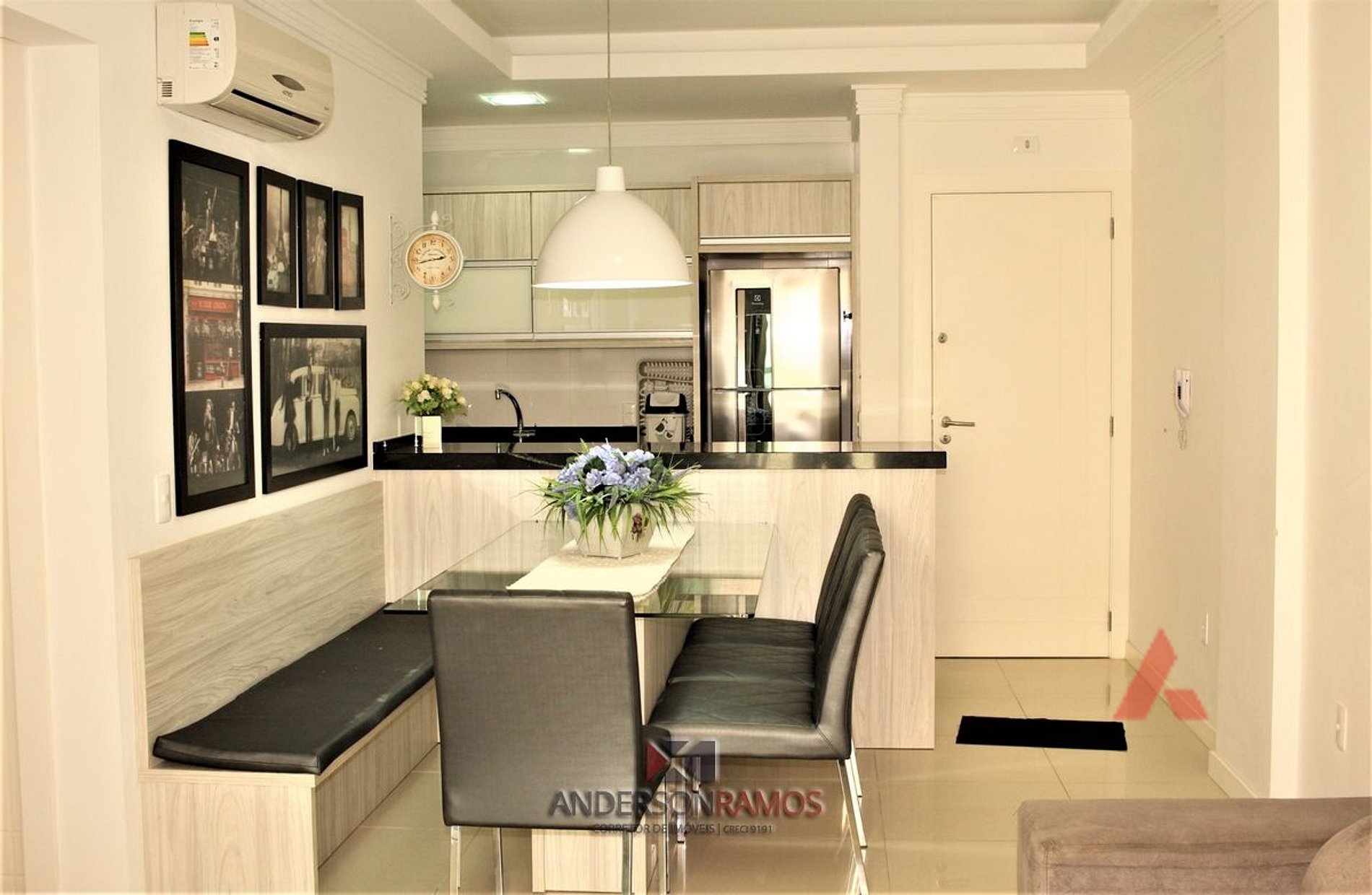 Sala de jantar e estar em um mesmo ambiente com tv e ar condicionado