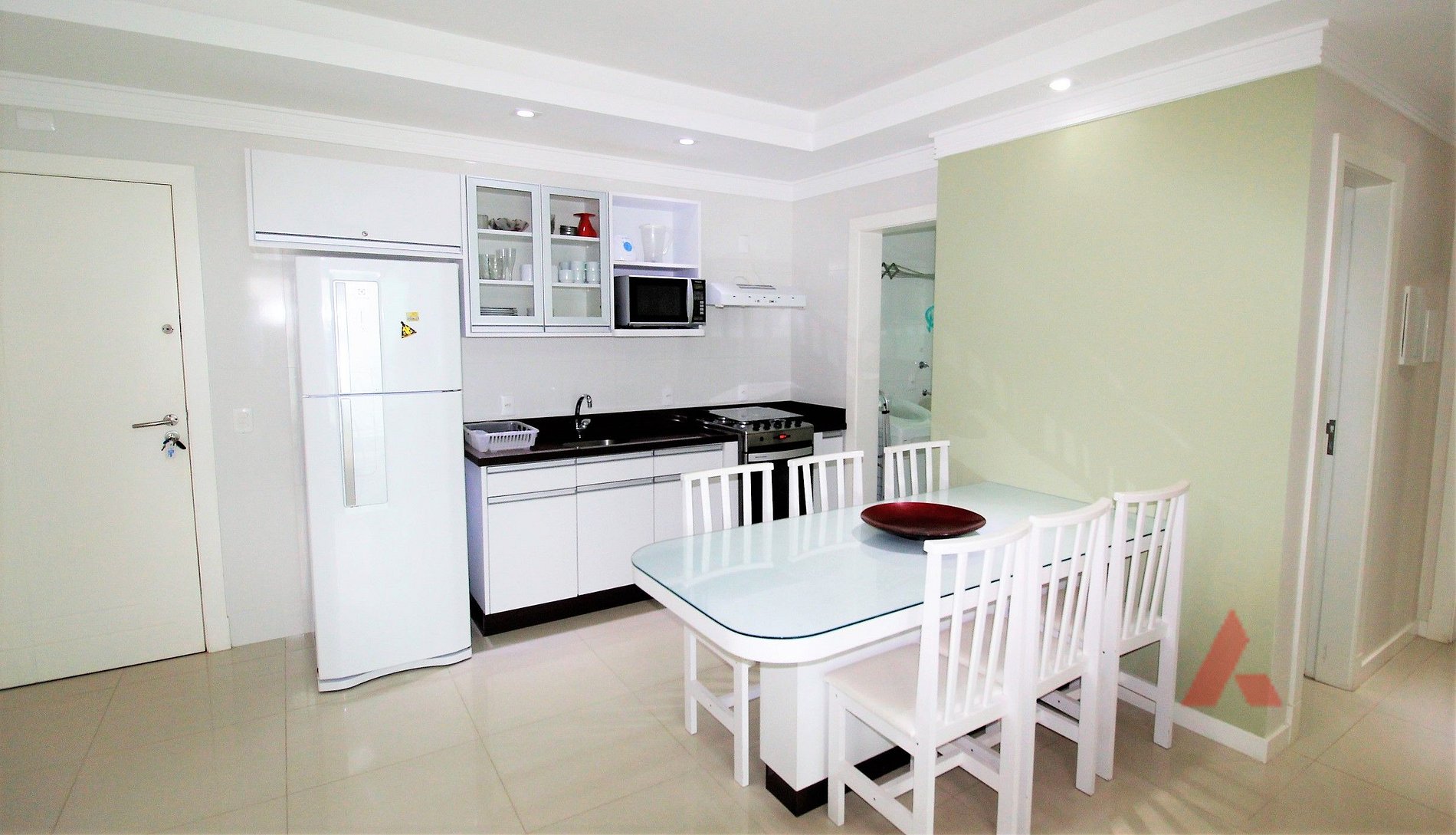 Cozinha completa com micro ondas e demais utensílios.