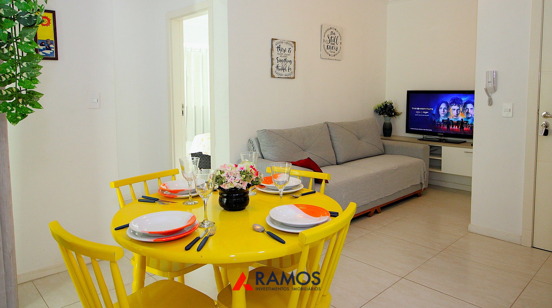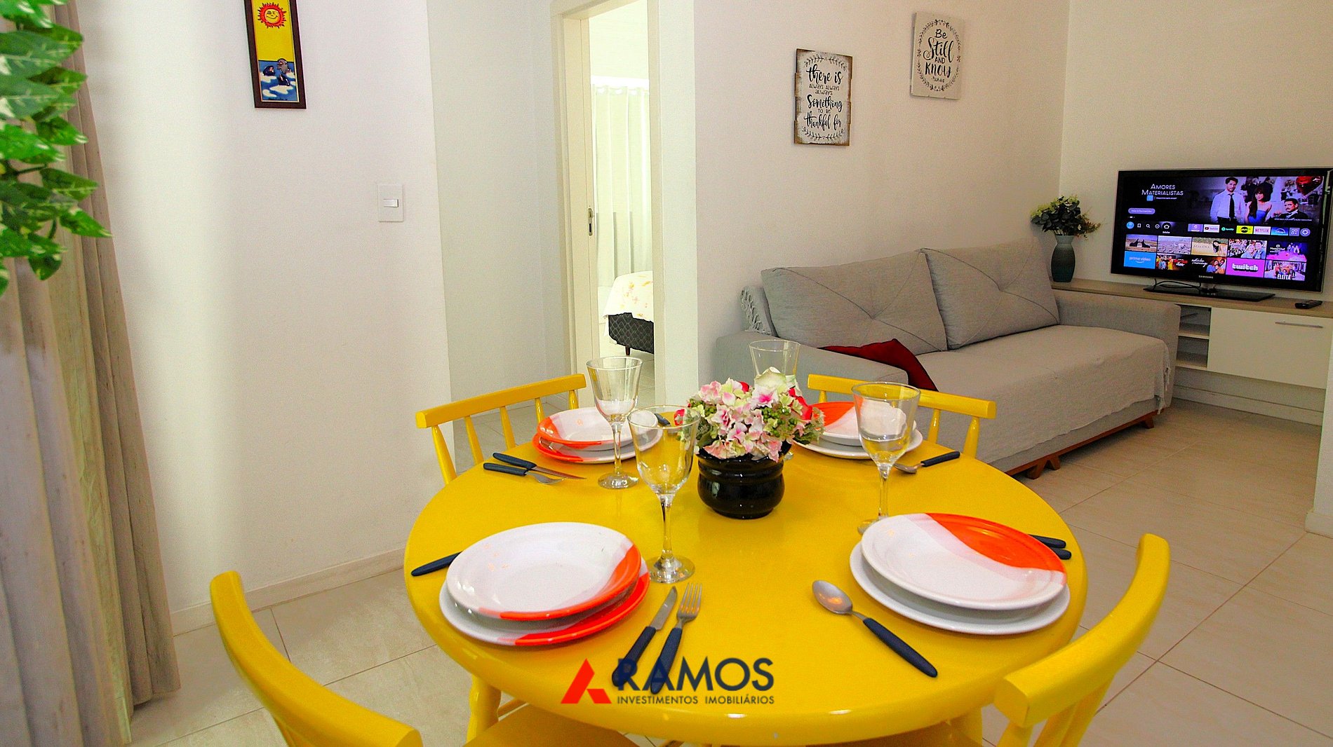 sala de estar e jantar com tv.