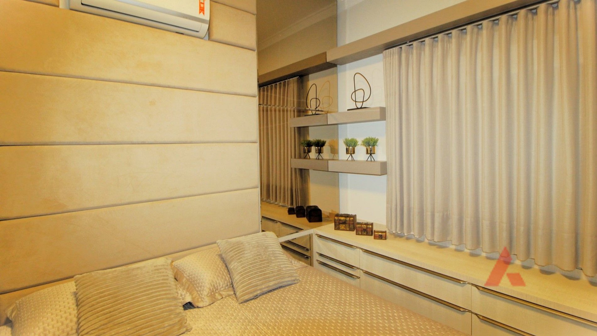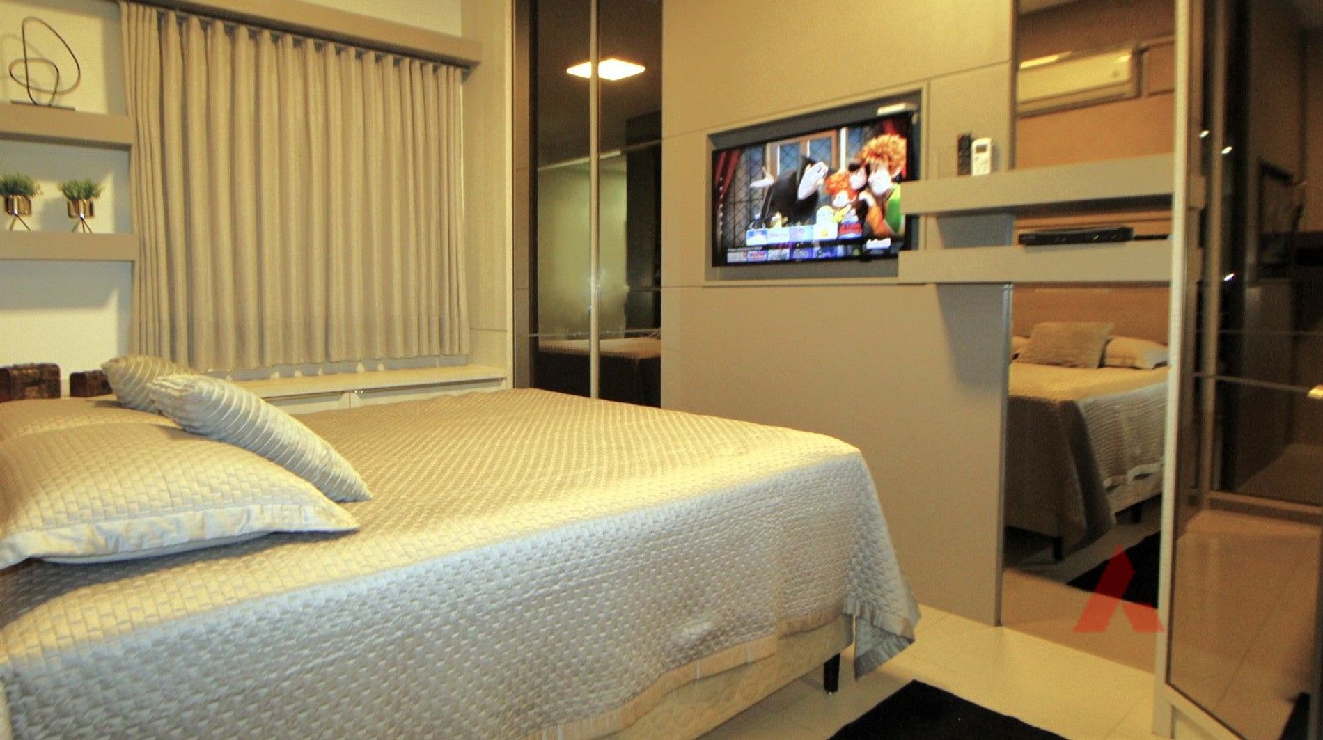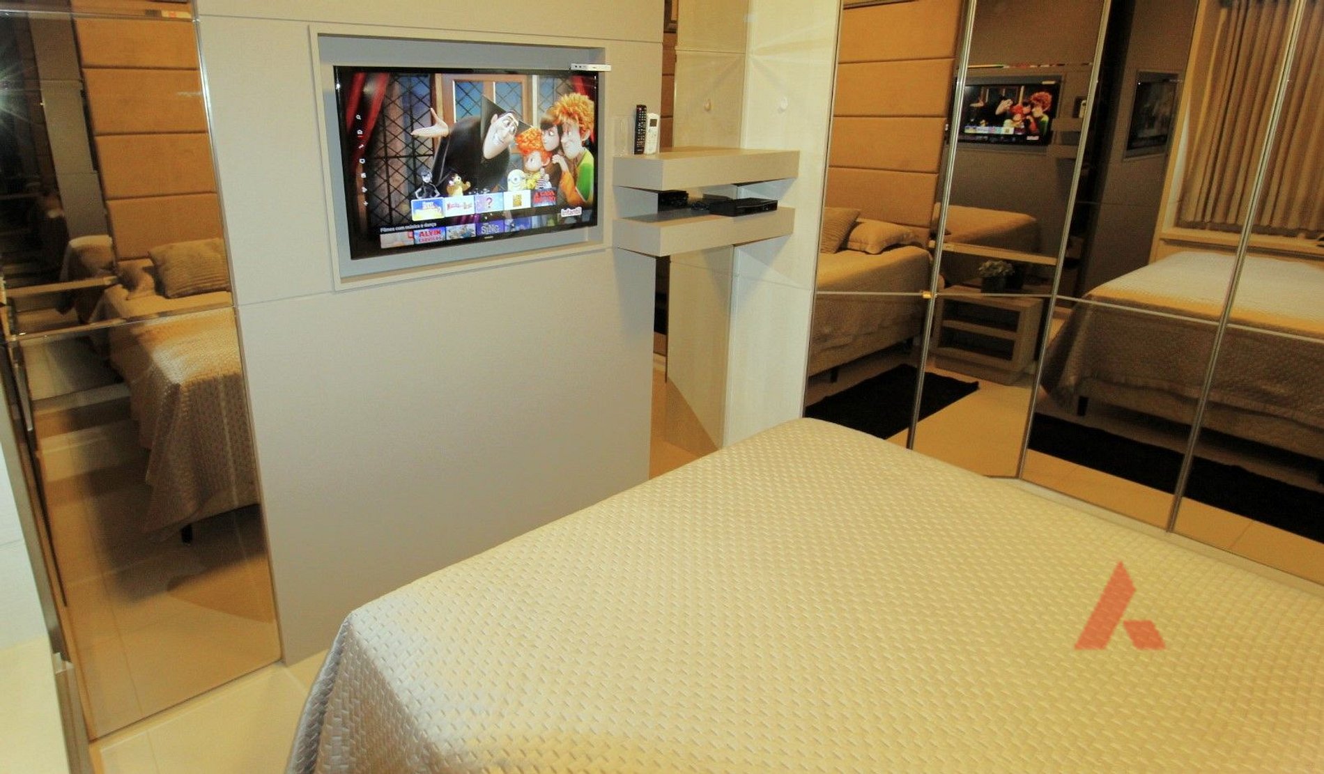 Uma suíte com cama box de casal (queen) com ar condicionado tipo split e tv.
