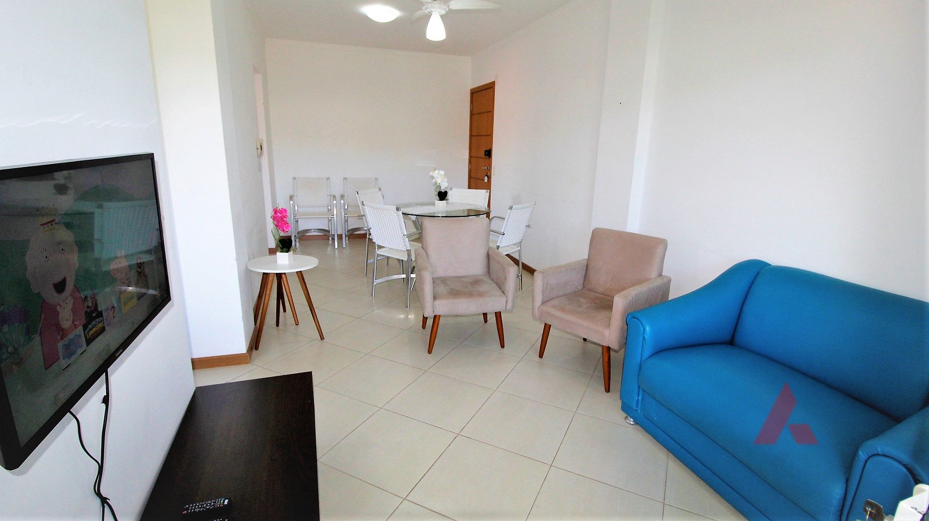 Sala de estar e jantar com TV, sofá .