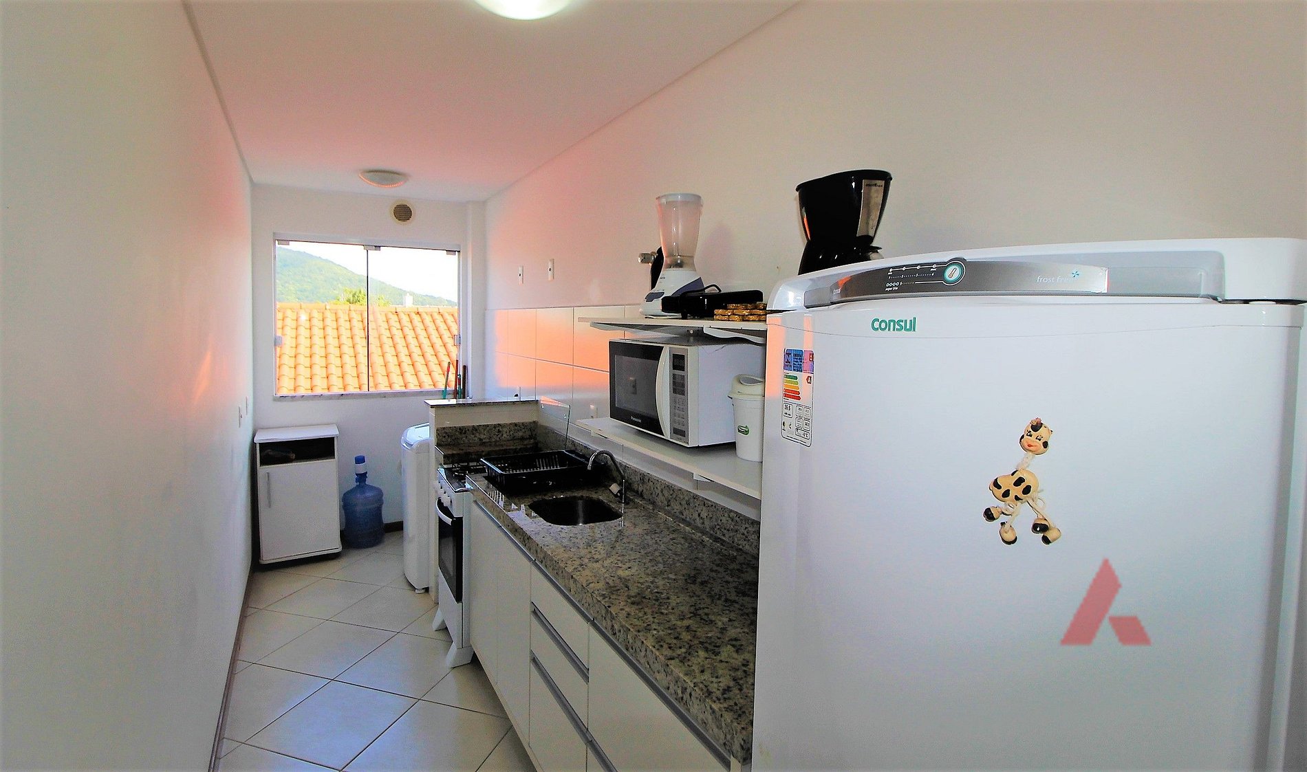 Cozinha com micro ondas e demais utensílios.