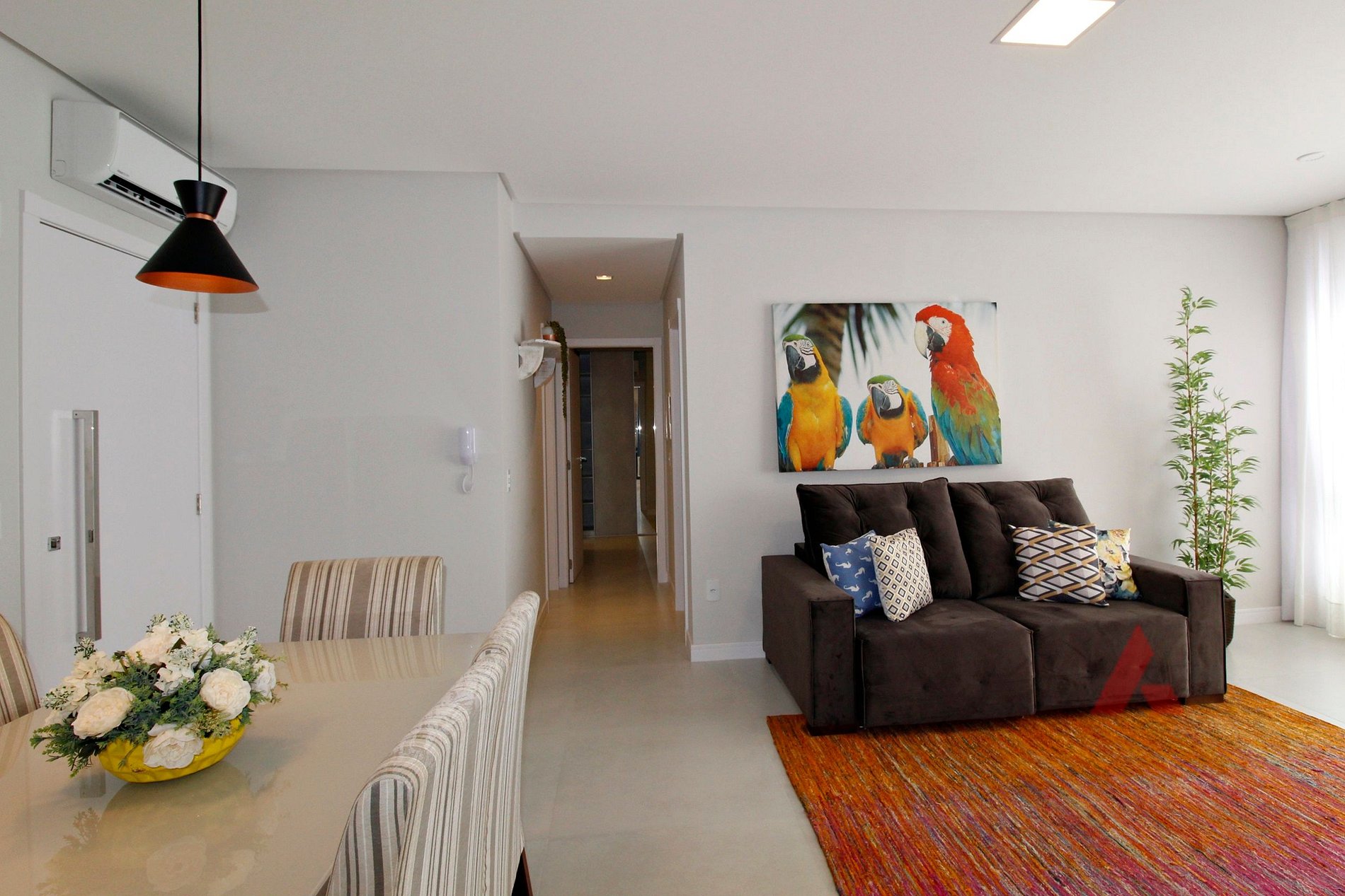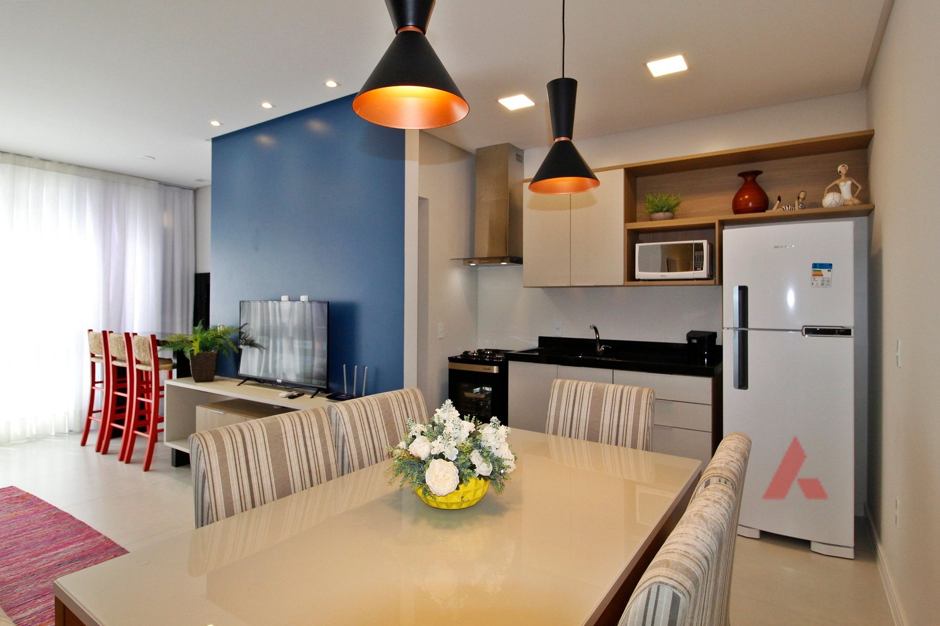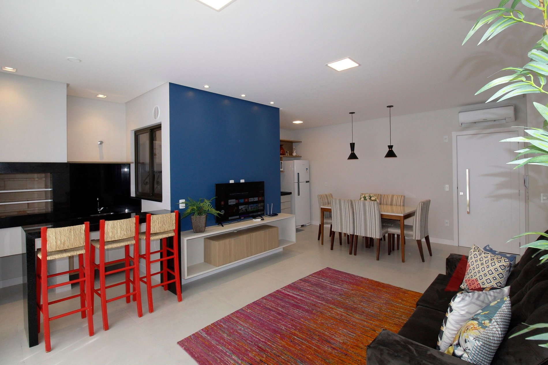 sala de estar e jantar integradas com TV e ar condicionado.
