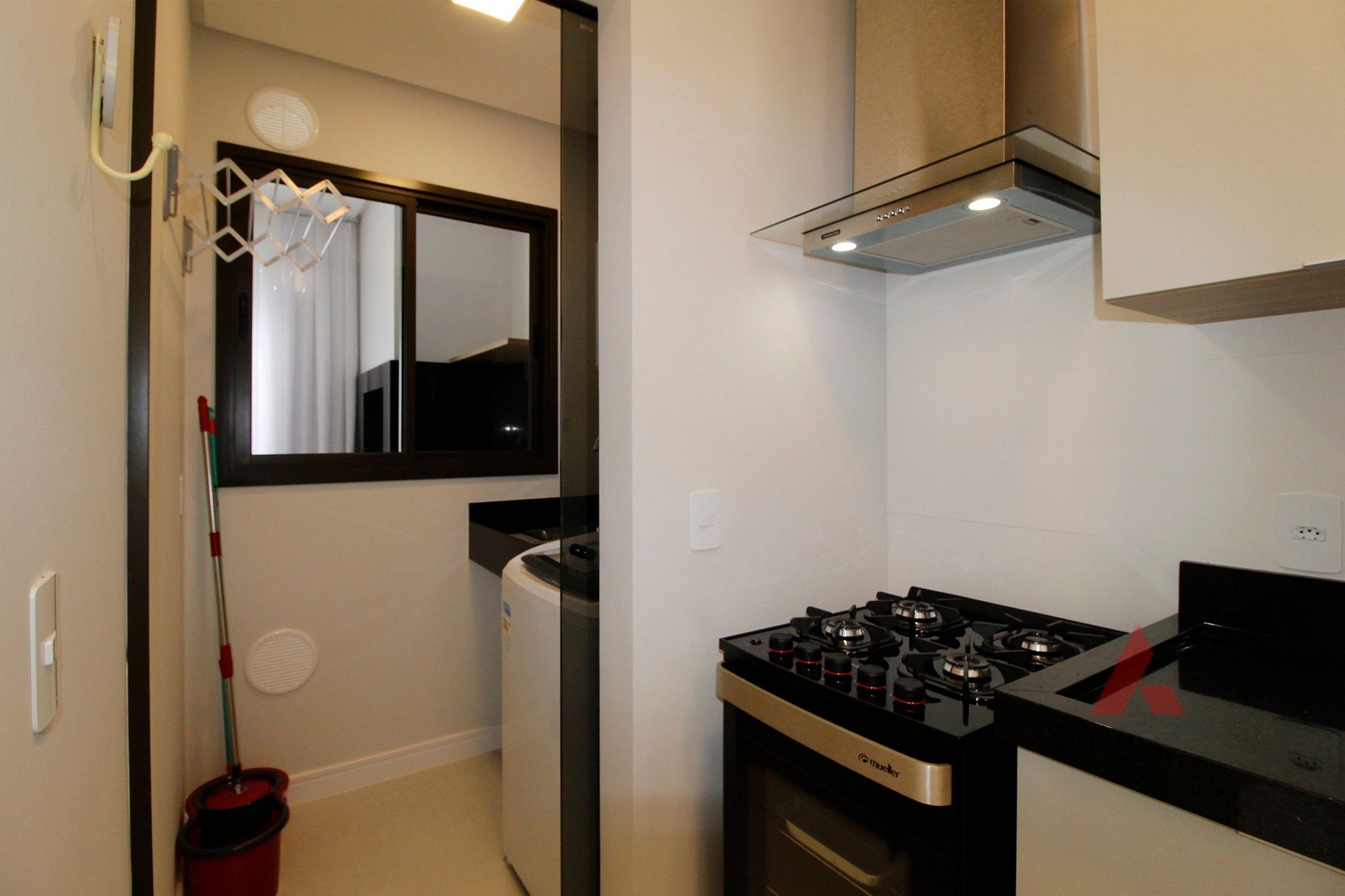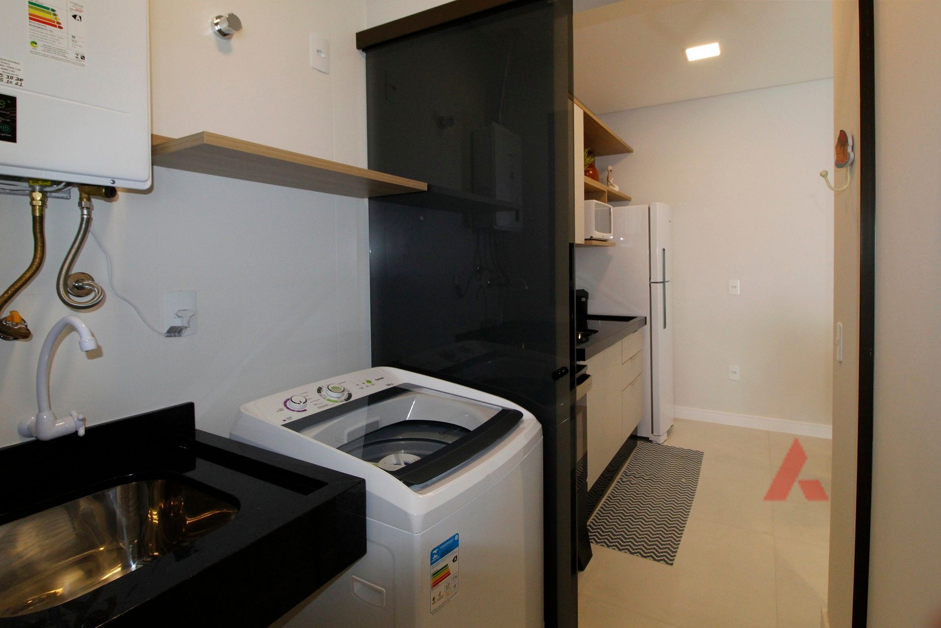 Área de serviço com lava roupas.