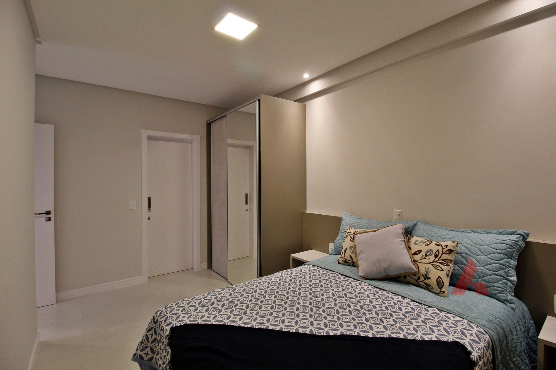 Uma suíte com cama de casal box, com ar condicionado.
