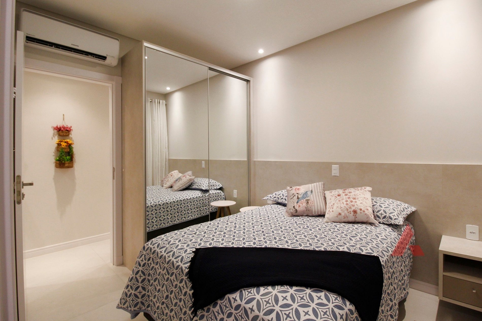Duas suítes com cama de casal box, com ar condicionado.