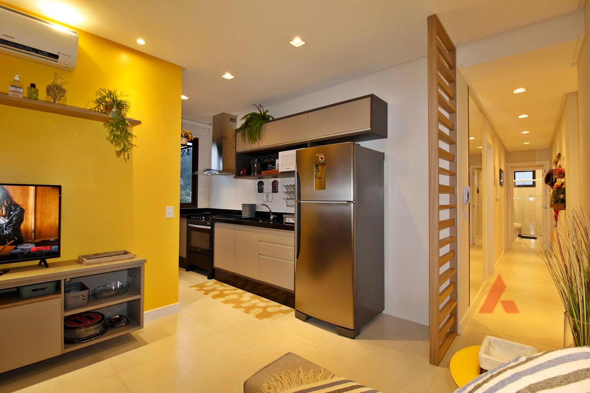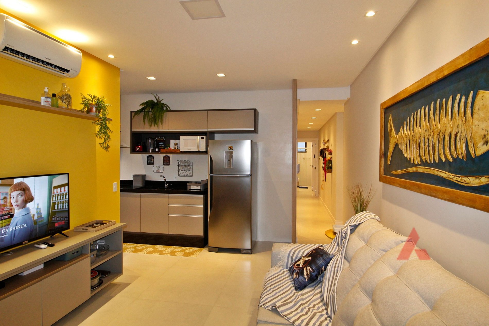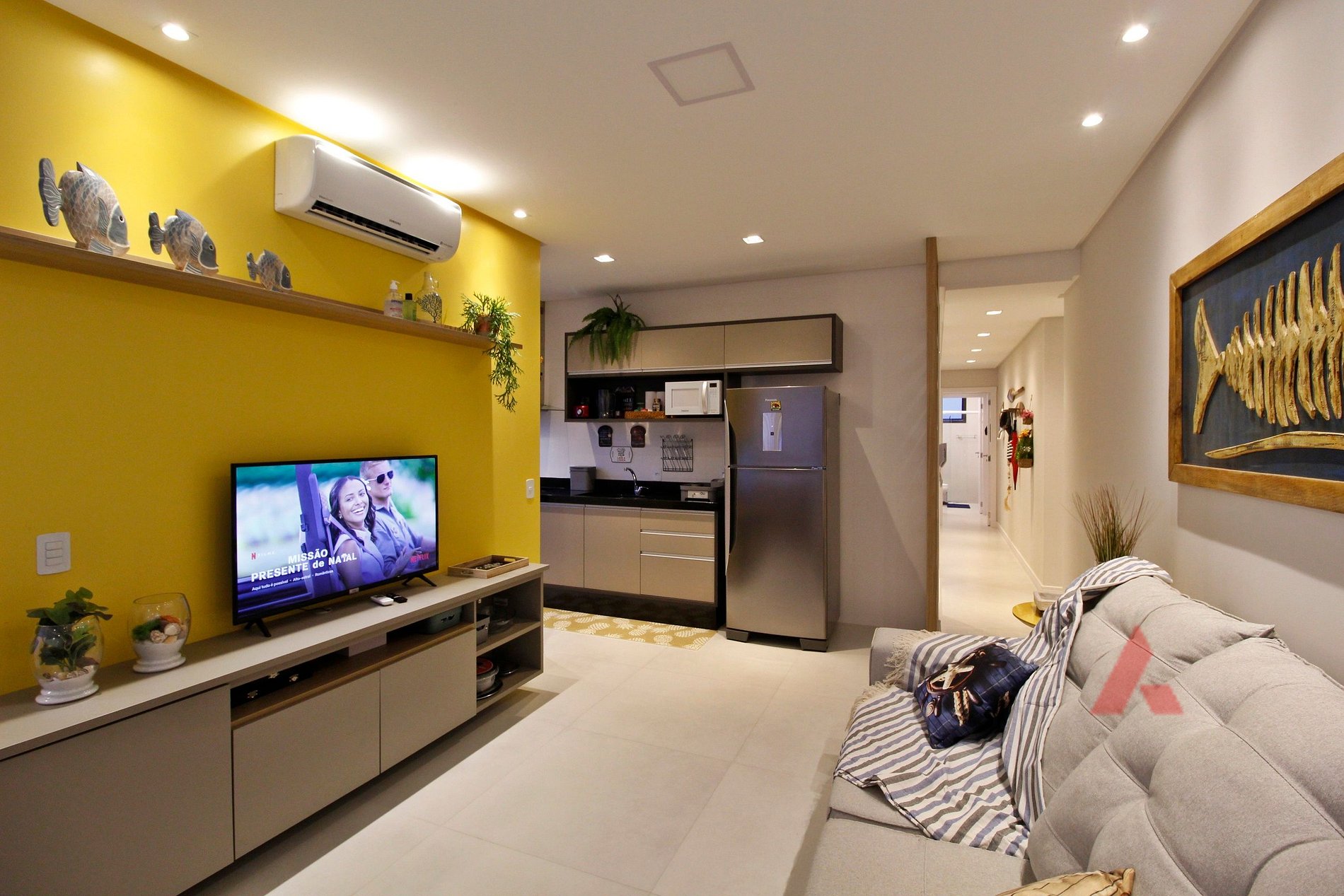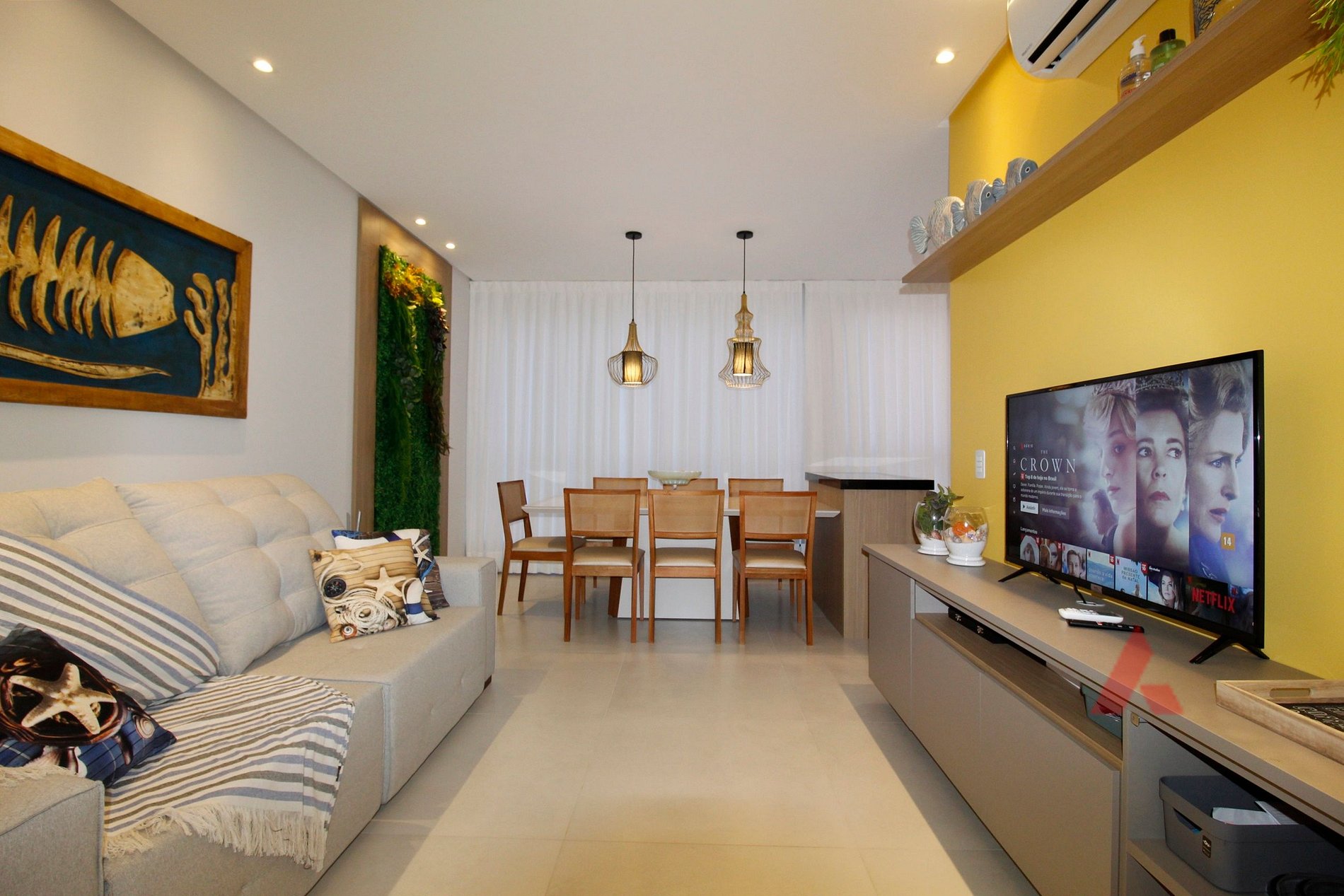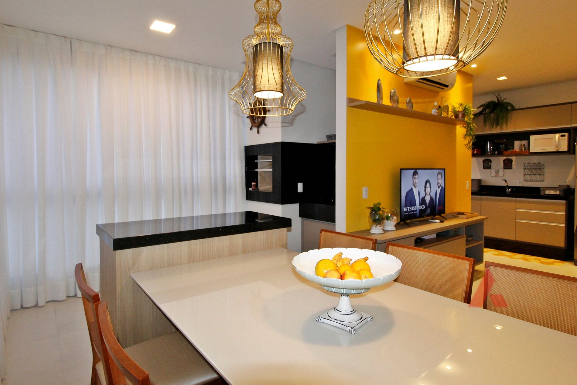 Sala de estar e jantar e área de churrasqueira integradas com TV e ar condicionado.