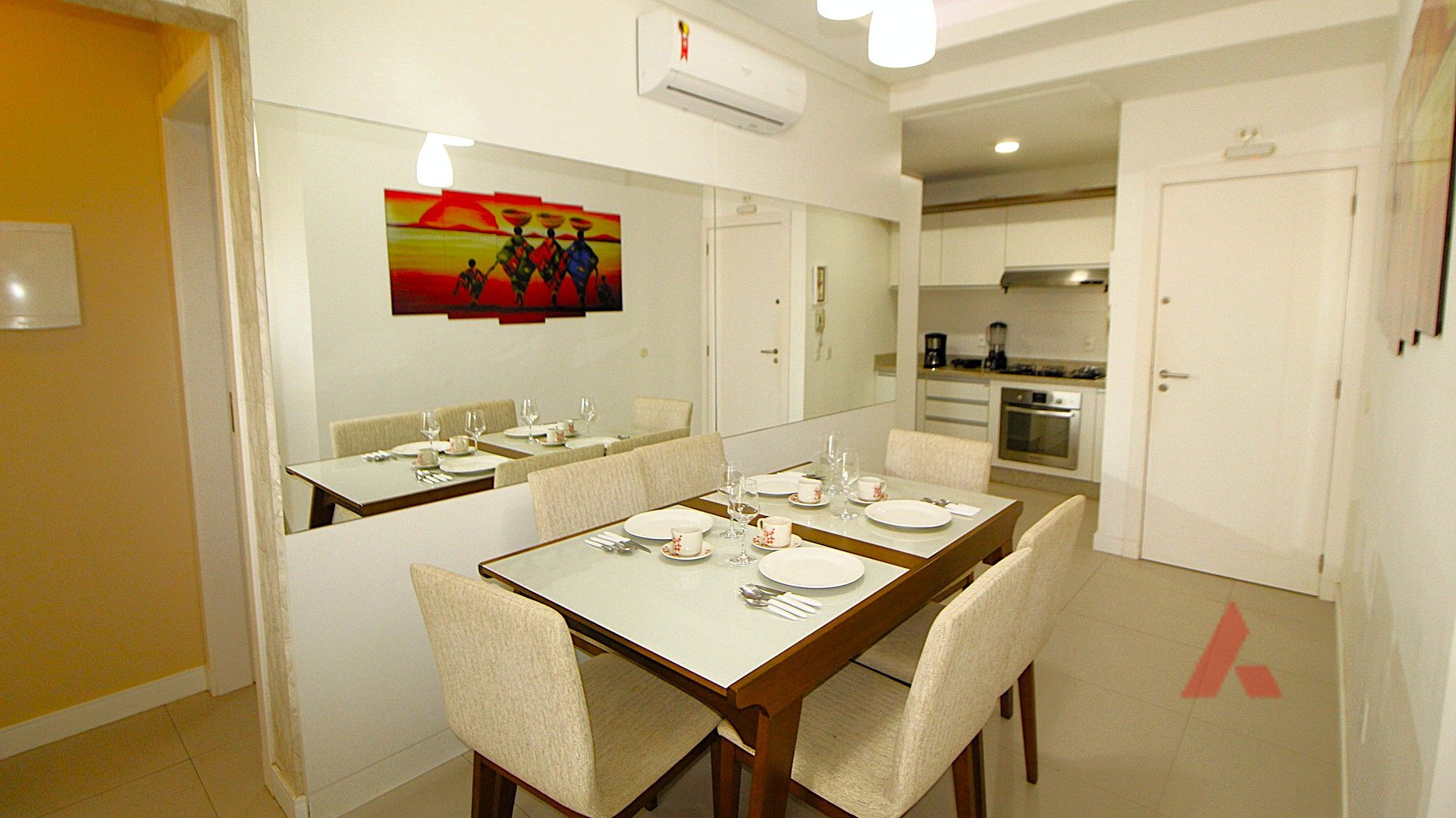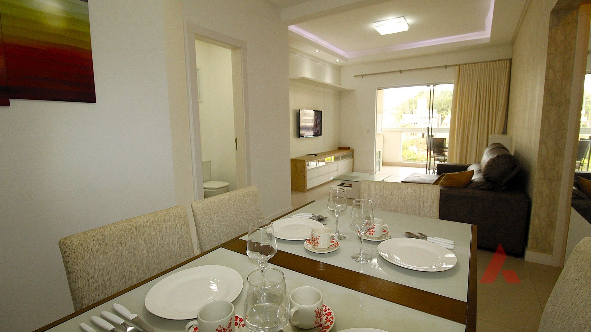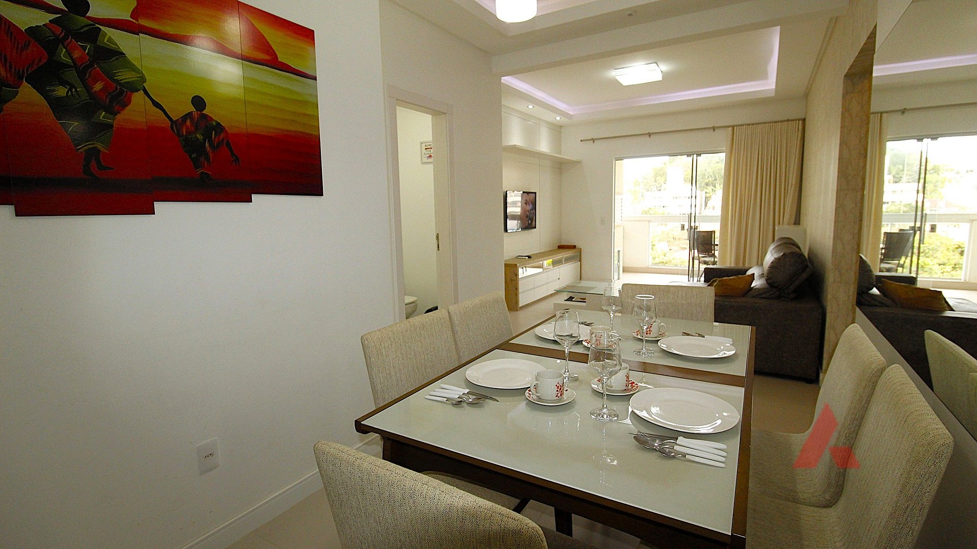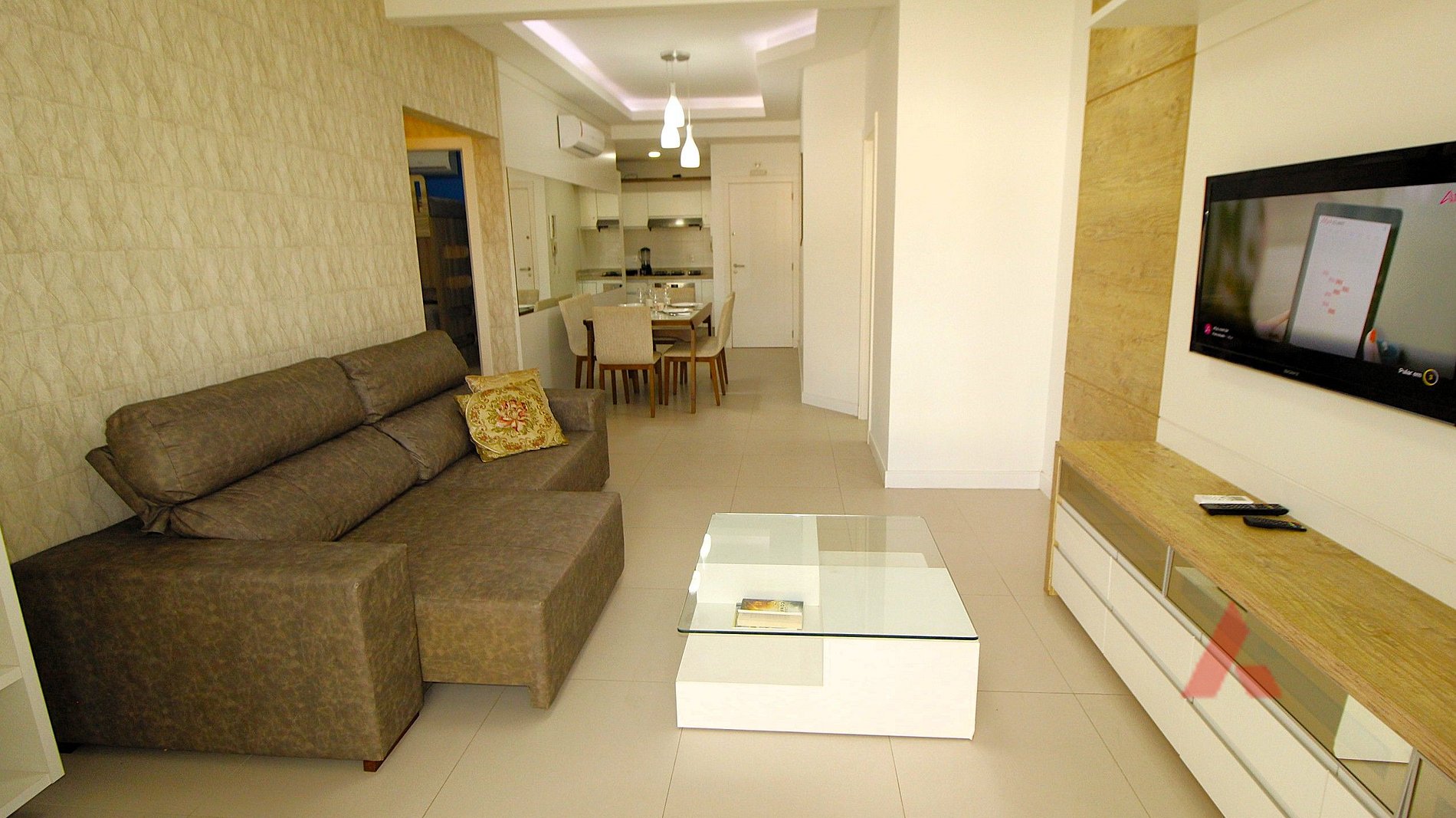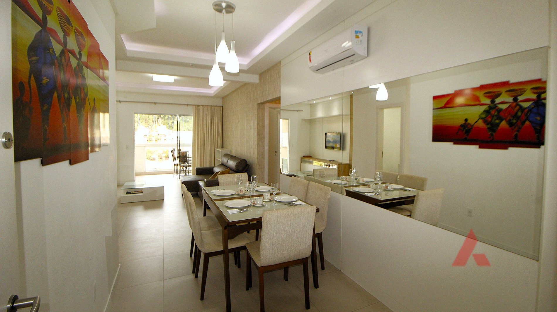 Uma sala de estar e jantar com televisor, ar condicionado tipo split e internet wi fi.