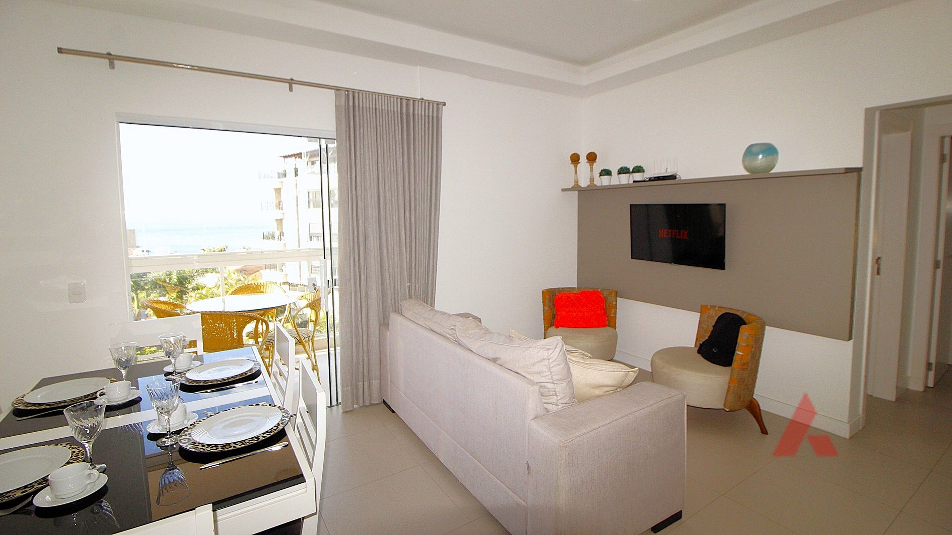 Uma sala de estar e jantar com televisor, ar condicionado tipo split e internet wi fi.