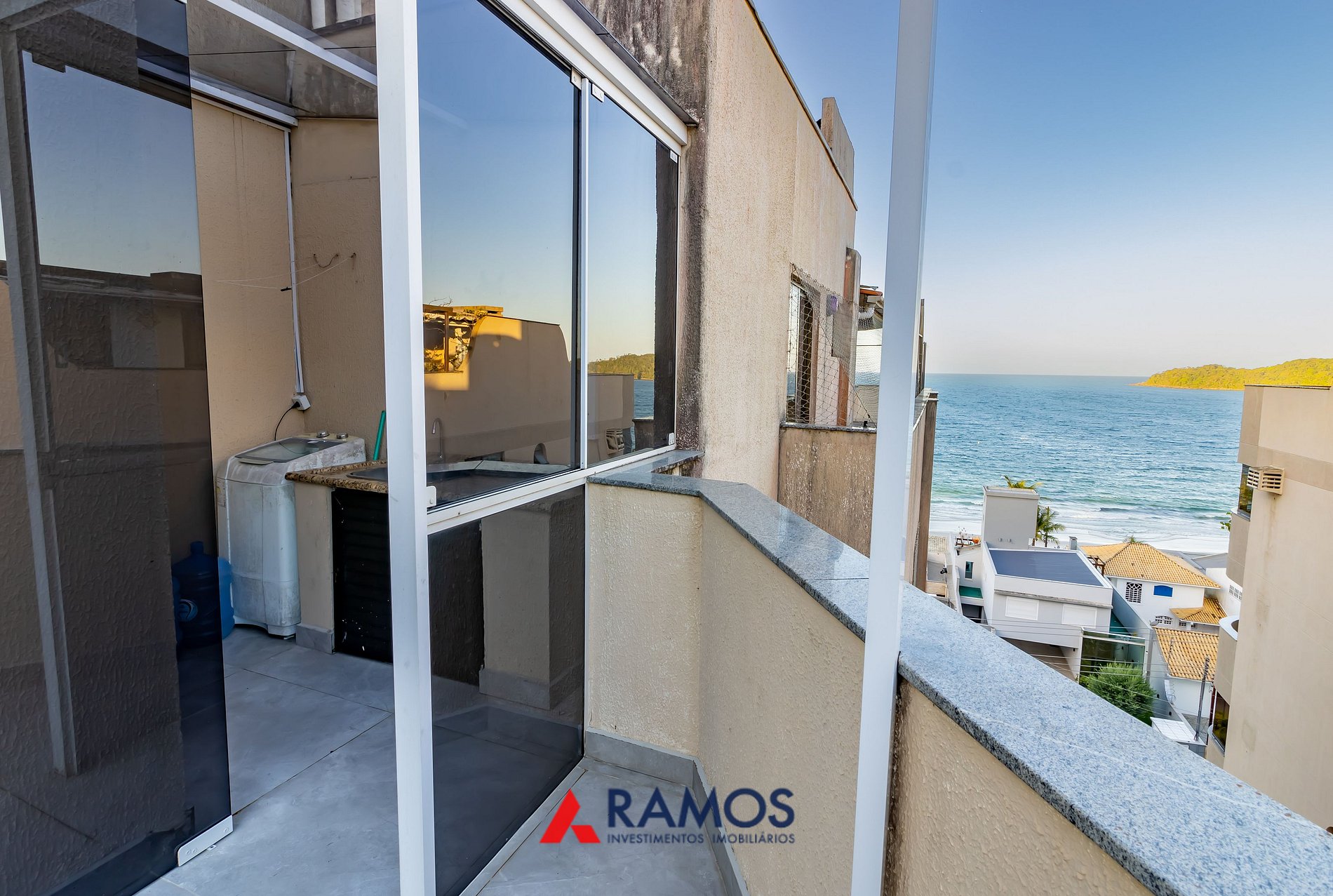 sacada com vista para o mar, área de serviço com lava roupas e churrasqueira.